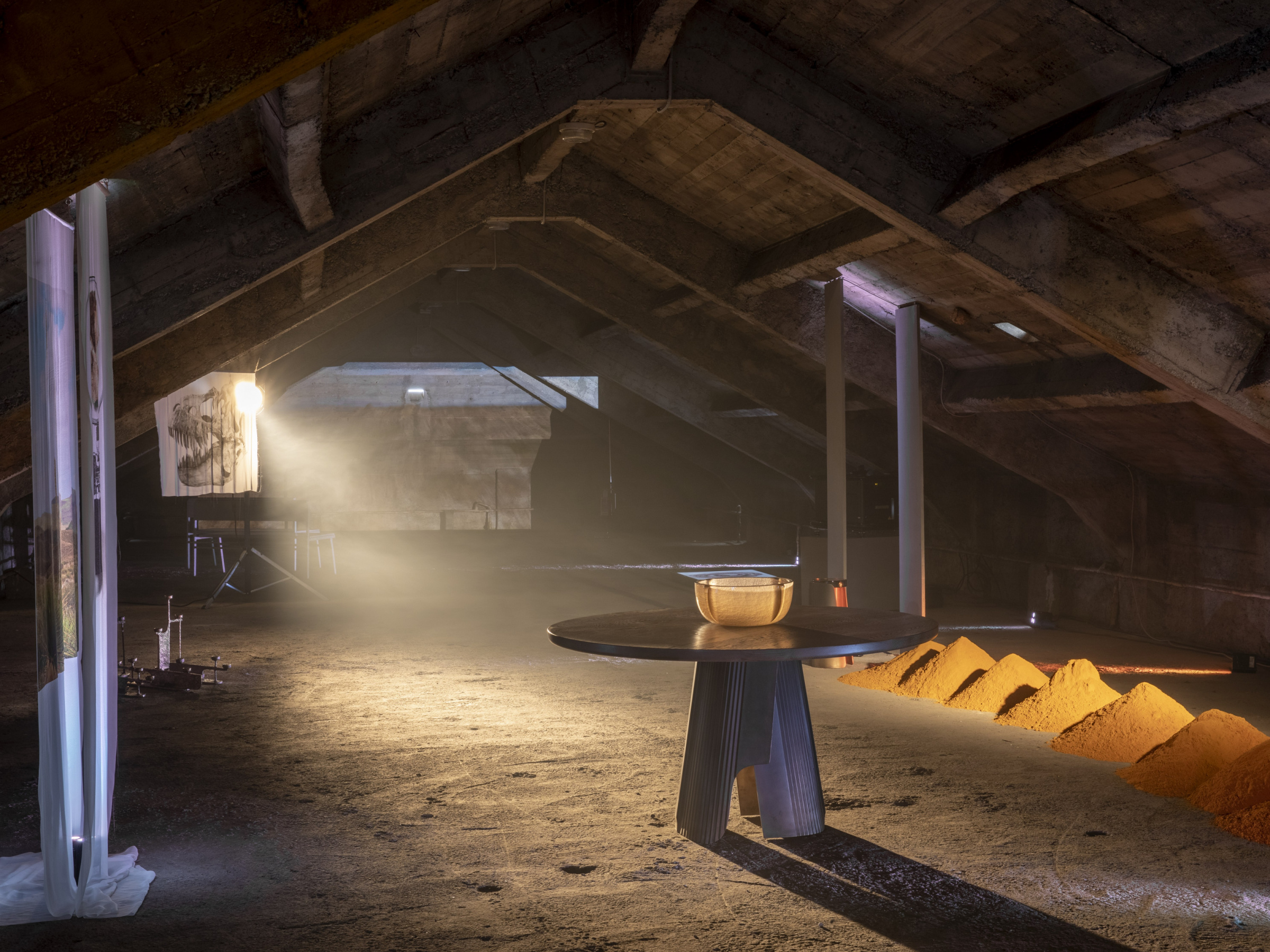 Chicago-based furniture design studio Refractory made its international debut at Alcova with “Holotype,” a multisensory exhibition in Alcova’s attic and terrace. Refractory’s furnishings found the company of paleontological specimens and frontiers by Sarah Wilson, together sharing the idea of decay and grit as a “comforting antidote to perfection.”
