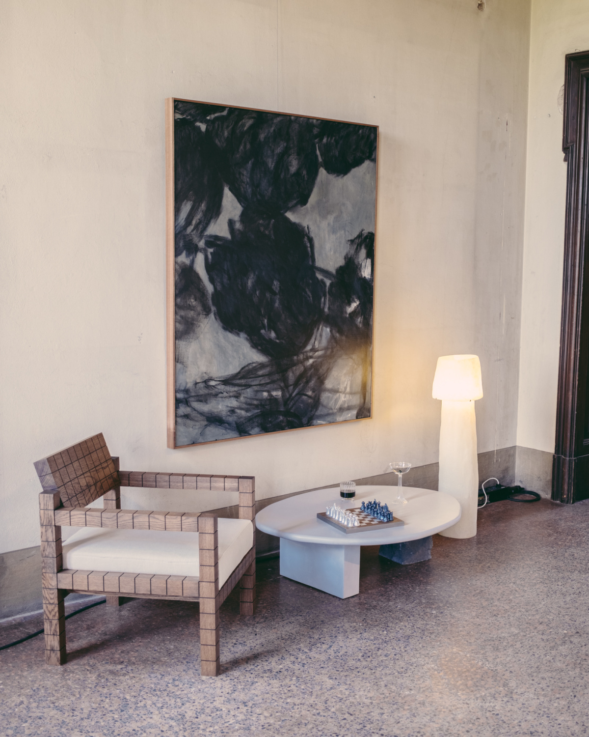 - “Landscape in Limburg,” painting by Nuria Maria; Kubik Armchair by Ergonomia; Mush lamp (tower) by Kilzi