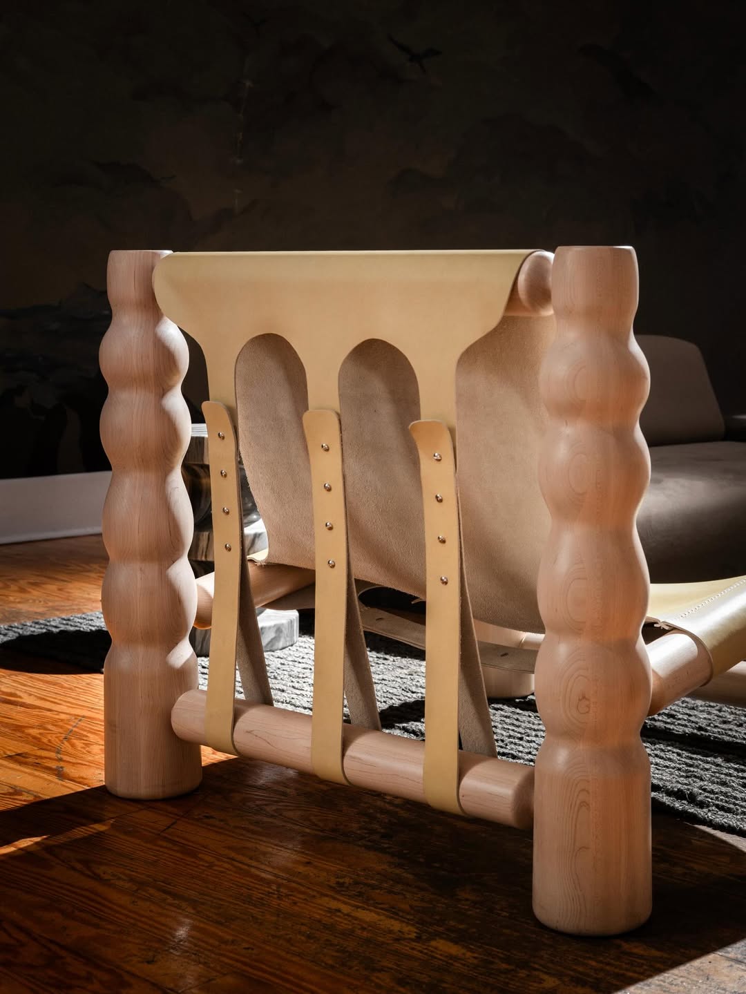 Anna Stechschulte, a handcrafted product designer based in Chicago, made the “Bubble Chair,” a rounded lounge chair with turned maple legs and a leather or cushioned fabric sling seat that hangs like a soft hammock inside a wooden frame.