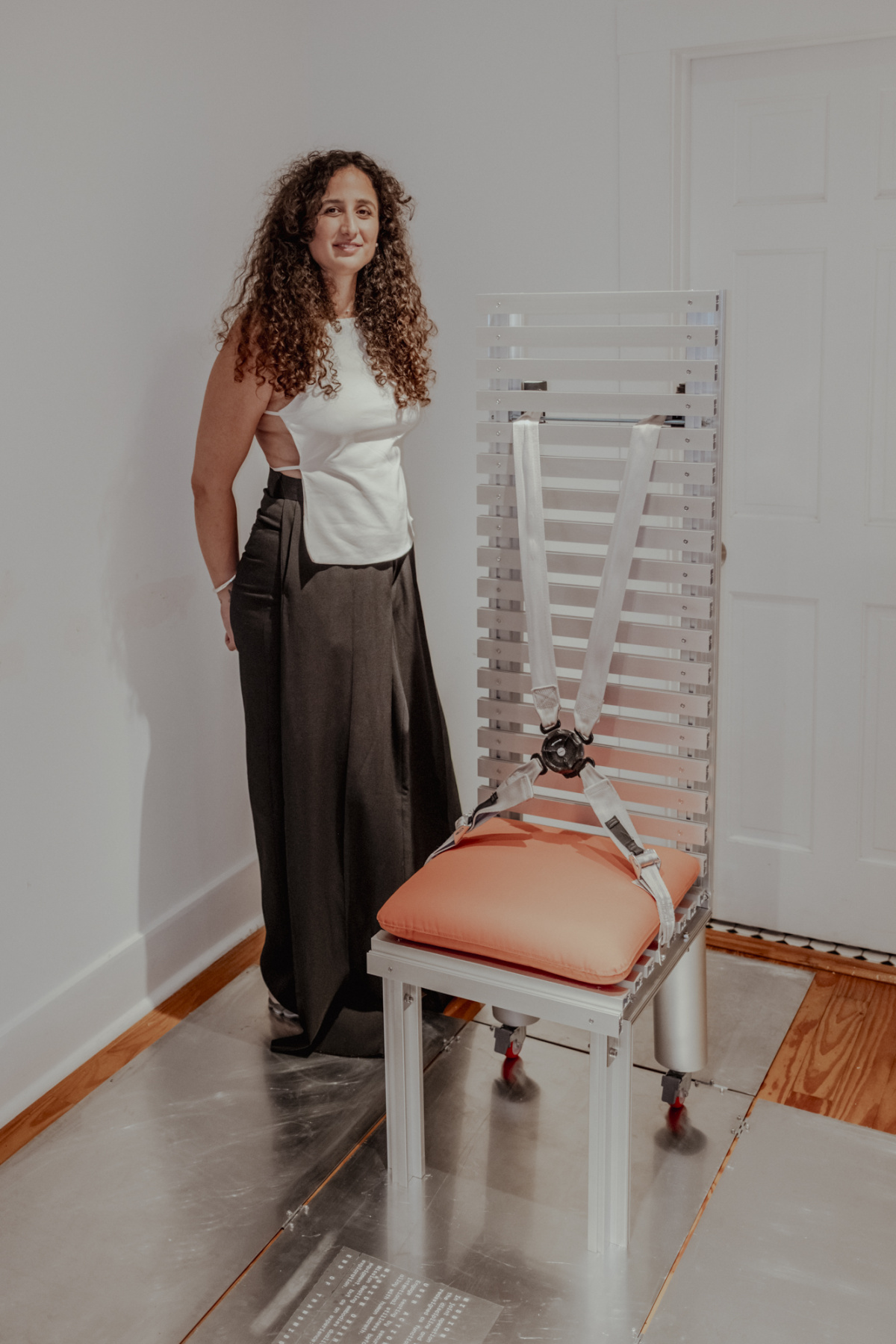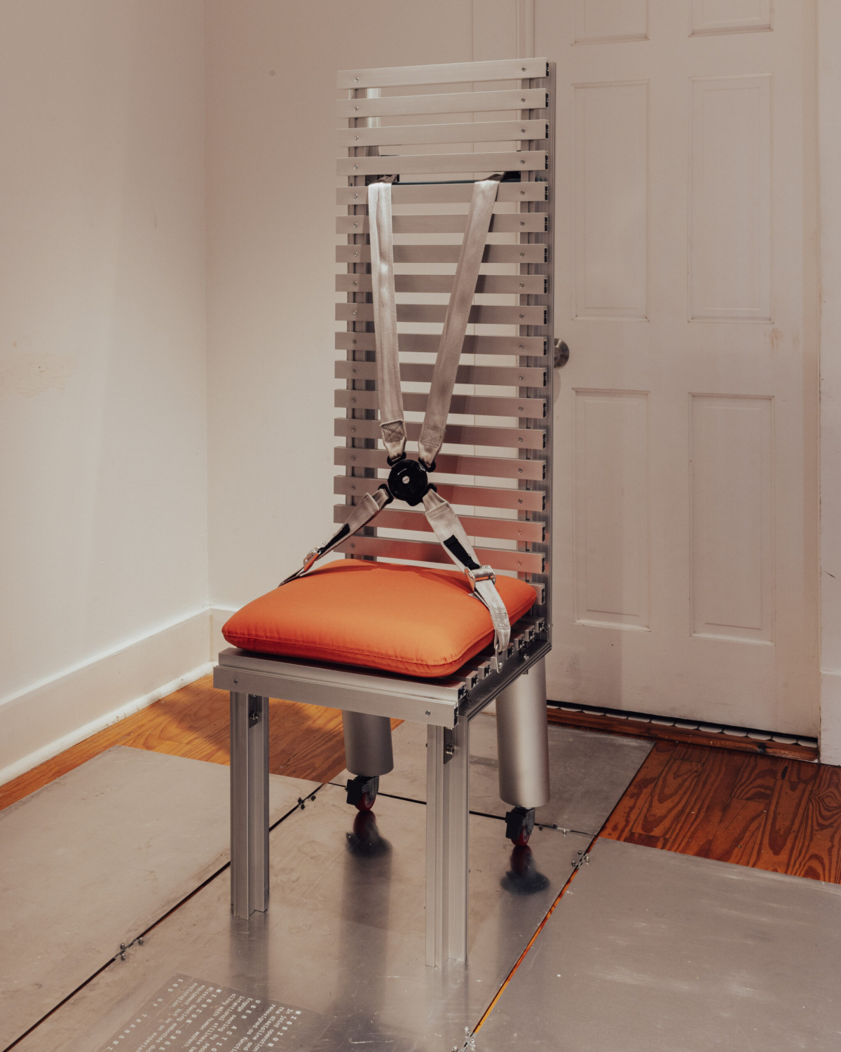 Strat Coffman, a spatial designer based in Los Angeles and Ann Arbor, made “The Railings,” a modular set of stainless steel bars and connectors wrapped with padded mats that can be assembled into a handrail -ike structure meant for touch, play, and shared movement in a room. It was originally crafted for a gay sauna in Detroit.