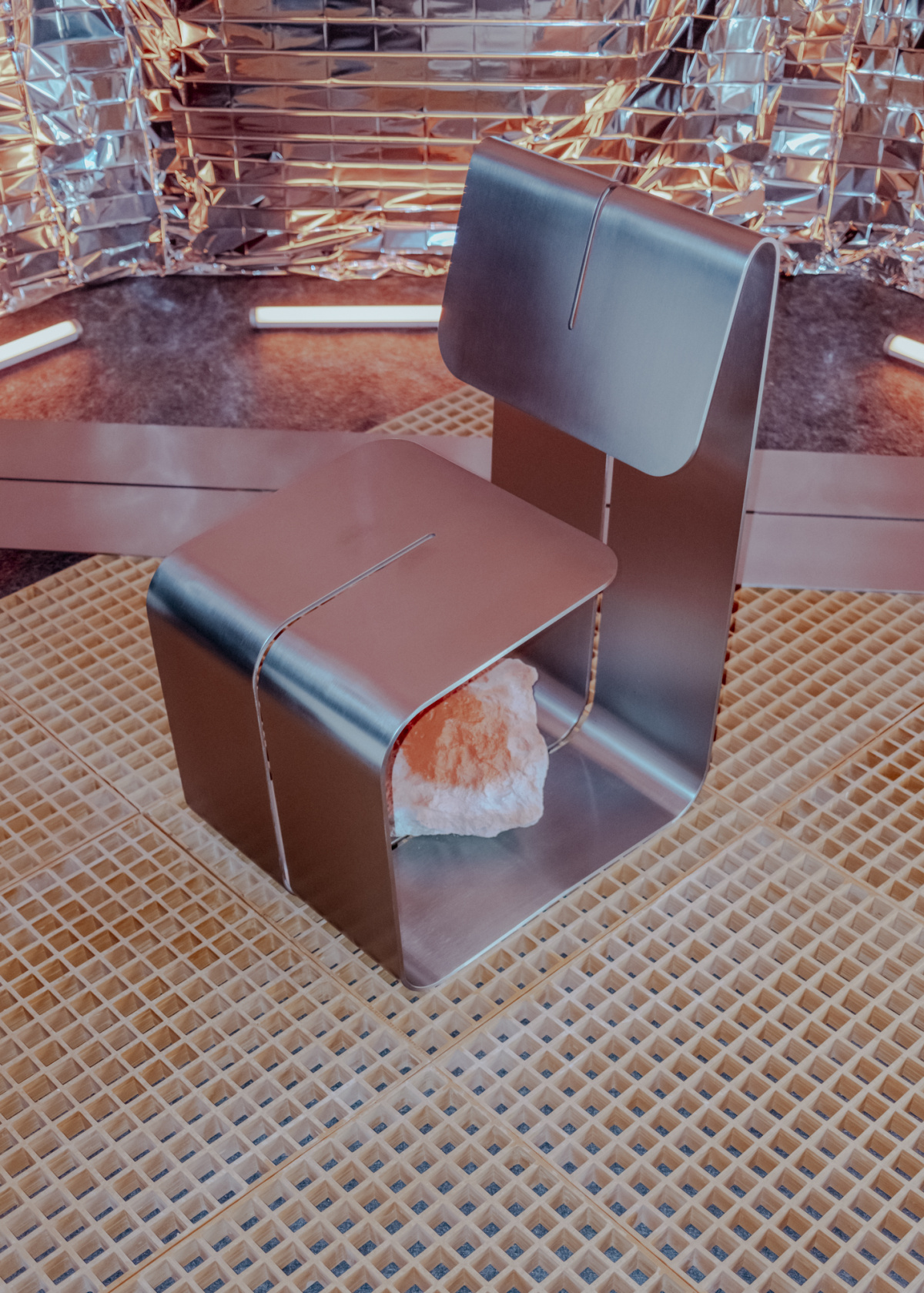 Christine Kalia, a designer from Cyprus, partnered with Muskita, a Cyprus based aluminium manufacturer, on “Mission Seating,” turning leftover aluminium window frame profiles into a sci-fi-feeling chair and bench with bright orange cushions and seatbelts.