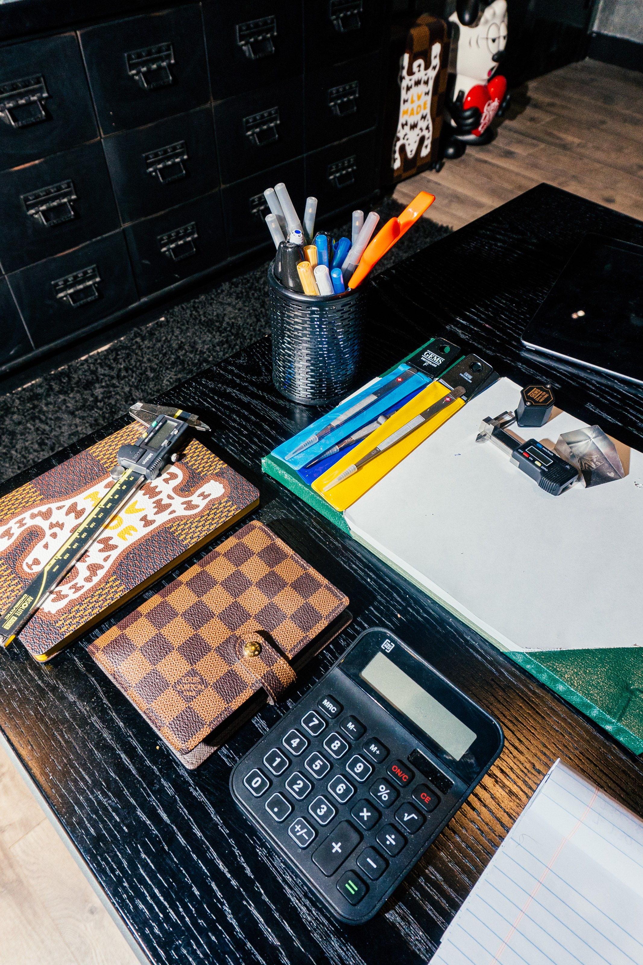 His office retains a more professional vibe. A large safe sits in one corner of the room, while the other displays collectibles including a figurine by Japanese artist Verdy—one of many clients on Alex’s custom jewelry roster. After our brief tour Alex settles into a swivel chair behind his desk, ready to resume our interview. But before we could chat about his routine, he has to carefully remove his grills.