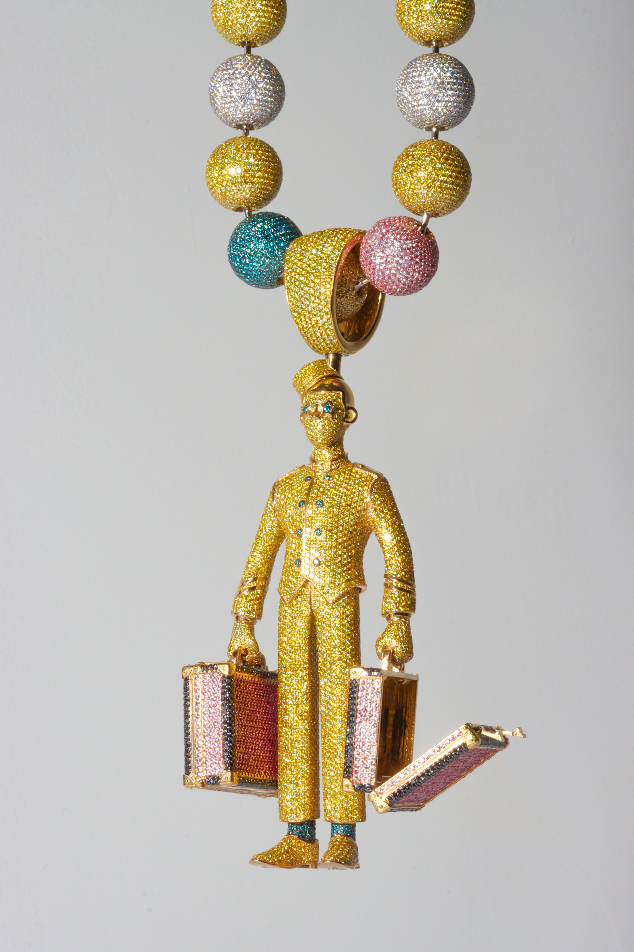 - Another work for Tyler, The Creator, the Bunny Hop piece with gumball chain includes 887 grams of 18K gold, 186 carats of VVS diamonds, 60 carats of pink sapphires, and 23,517 stones set by hand. Courtesy of Alex Moss