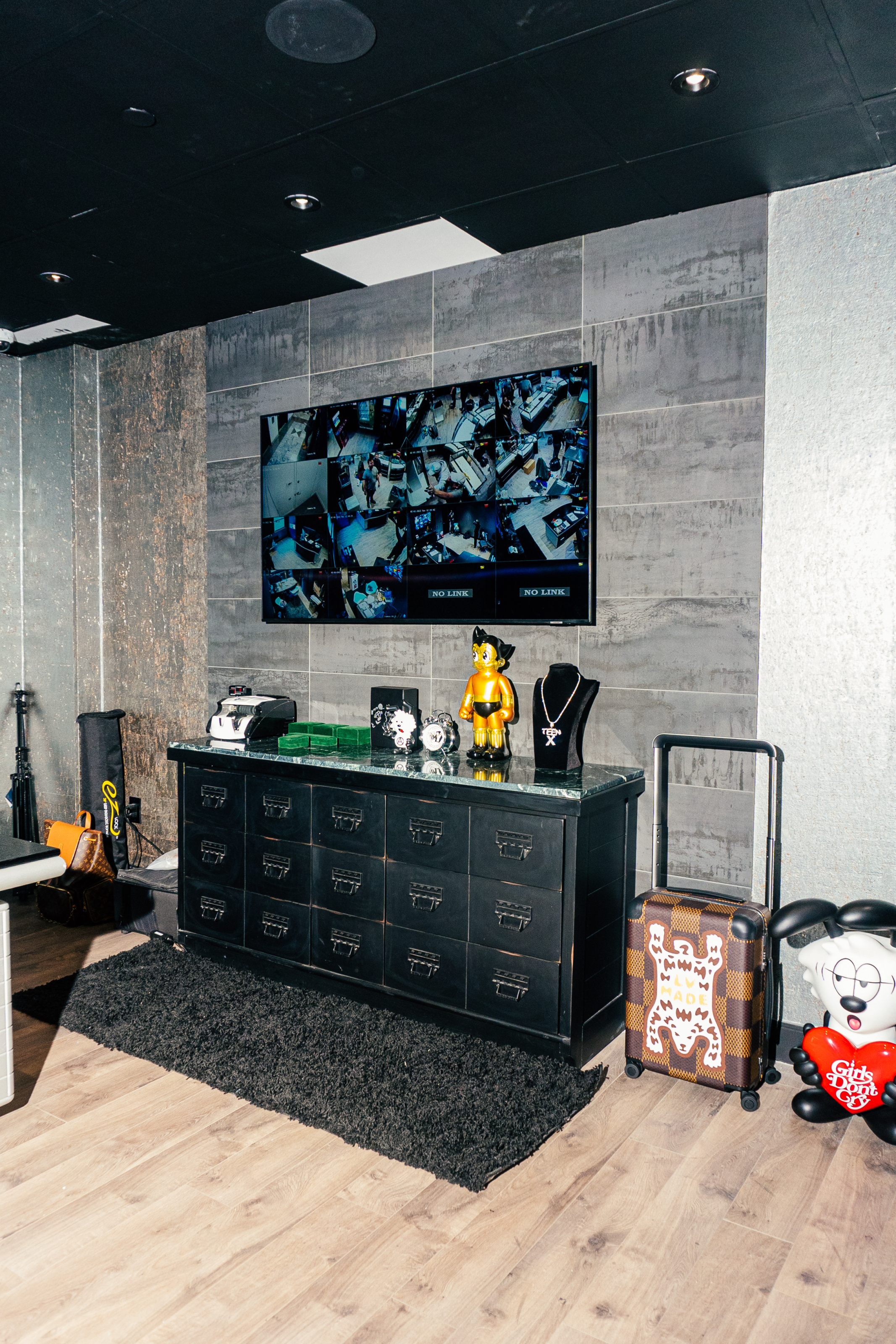 “You have to look good to feel good,” he tells me, claiming his look isn’t only for the scheduled photo shoot, but a daily occurrence. The room’s sleek black walls match elegant jewelry cases, complementing a set of newly installed marble backsplashes. Small pops of color add a bit of whimsy to the space, down to a tiny heart-shaped rug.