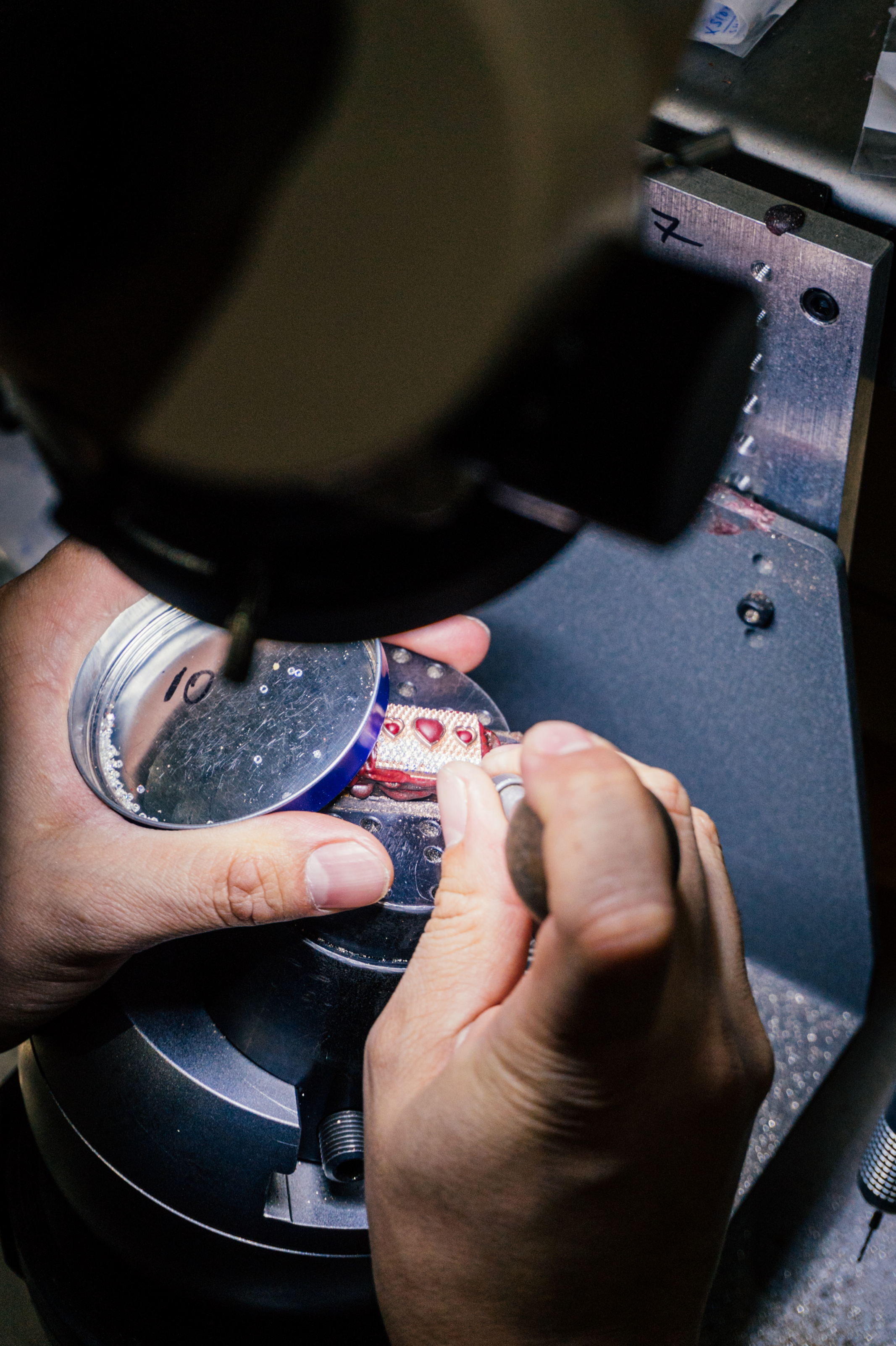 - In Alex Moss’ New York studio, artisans undertake the painstaking task of setting the diamonds. Photo by Poupay Jutharat