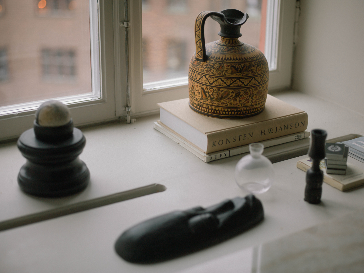 Alexander, an artist known for his multidisciplinary storytelling, began his creative path first with graffiti, then later photography, fashion, music, sculpture, and large-scale installation. Above: A windowsill in Alexander’s home. Photo by Noah Agemo.
