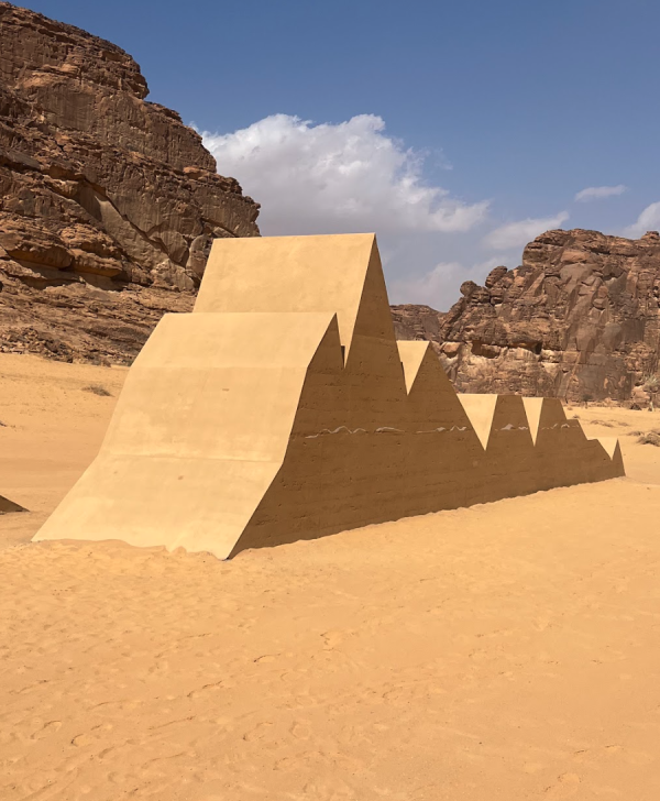 Closer to the Al-Jaddidah arts district, Agnes Denes designed the Living Pyramid. It is part of the biennial Desert X, but also a longer term fixture of AlUla and a preamble to the future installations at Wadi AlFann. Agnes has returned to the pyramid motif throughout her career for its symbolism.