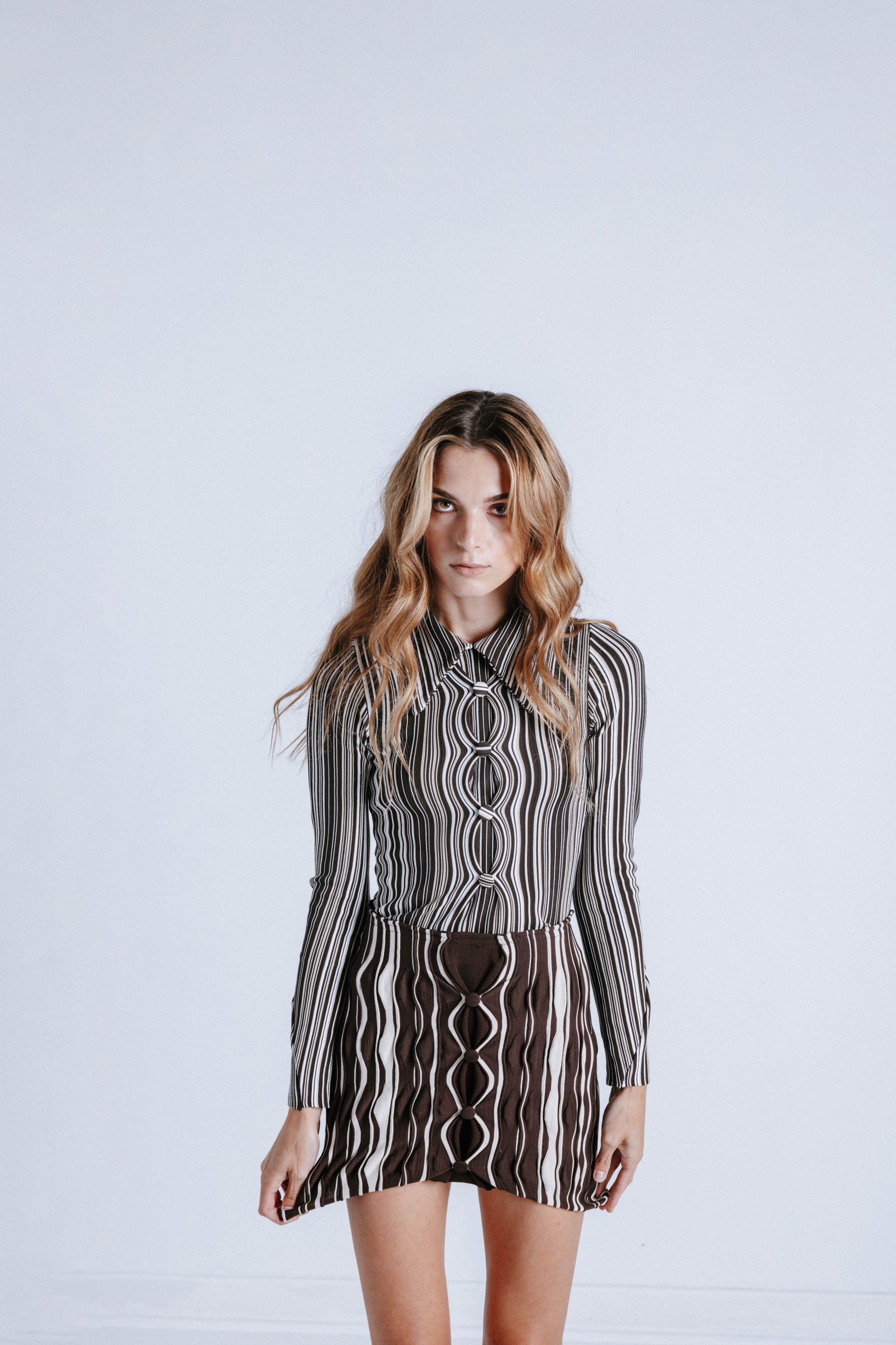 ← Anne Isabella’s collections also bring a tactile, organic dimension to reimagined 1960s and ‘70s-inspired garments. Through her method of incorporating scanned prints into her designs, the collection moves outside of the 2D realm of print to a third dimension. Warped motifs on knitwear, like those seen on her Kaleidoscopic skirt, carry themes of shadow play and repetition. As in nature, there is an element of the unexpected, embraced in discordant texture and print. “My collections often start with research, exploration, testing things, and trying to create new shapes,” she says. “Eventually, the process stops and the pieces take over and have a life of their own.”