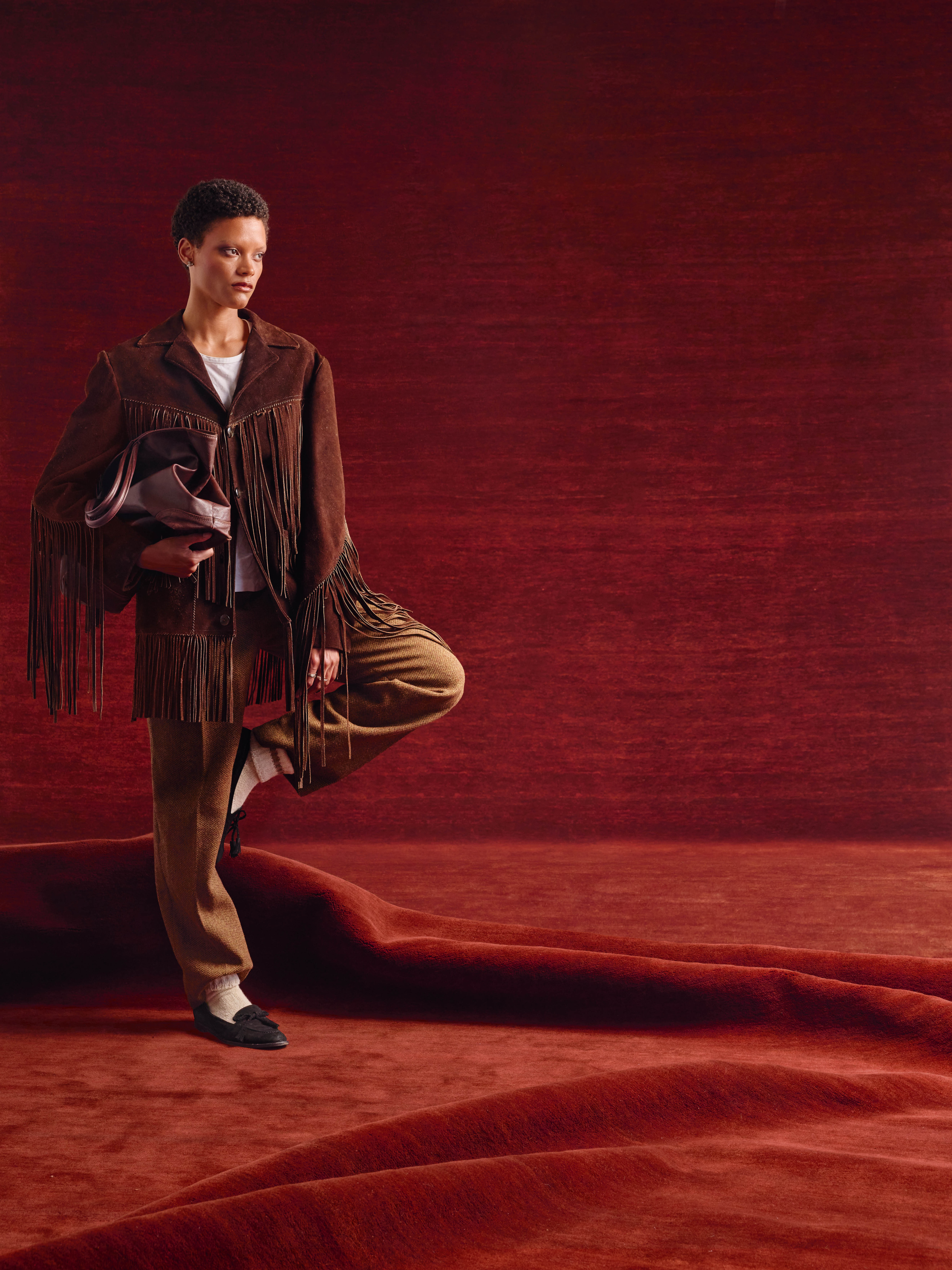Agra rug in Burnt Umber by ARMADILLO. ‘70s suede fringe jacket. ‘70s GUCCI tweed trousers. Vintage cotton tee. MANOLO BLAHNIK suede loafers