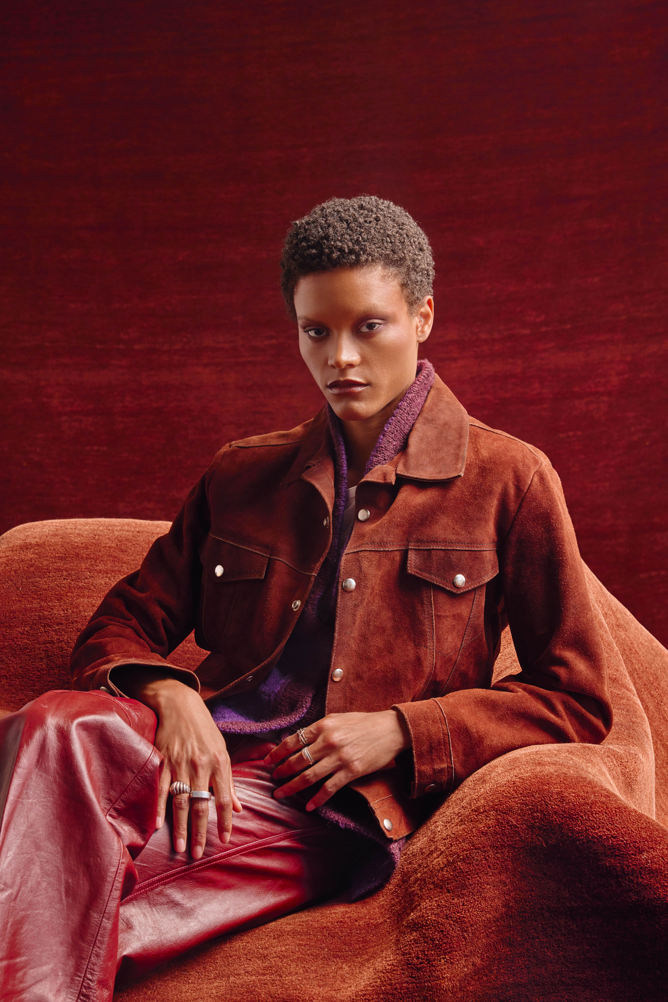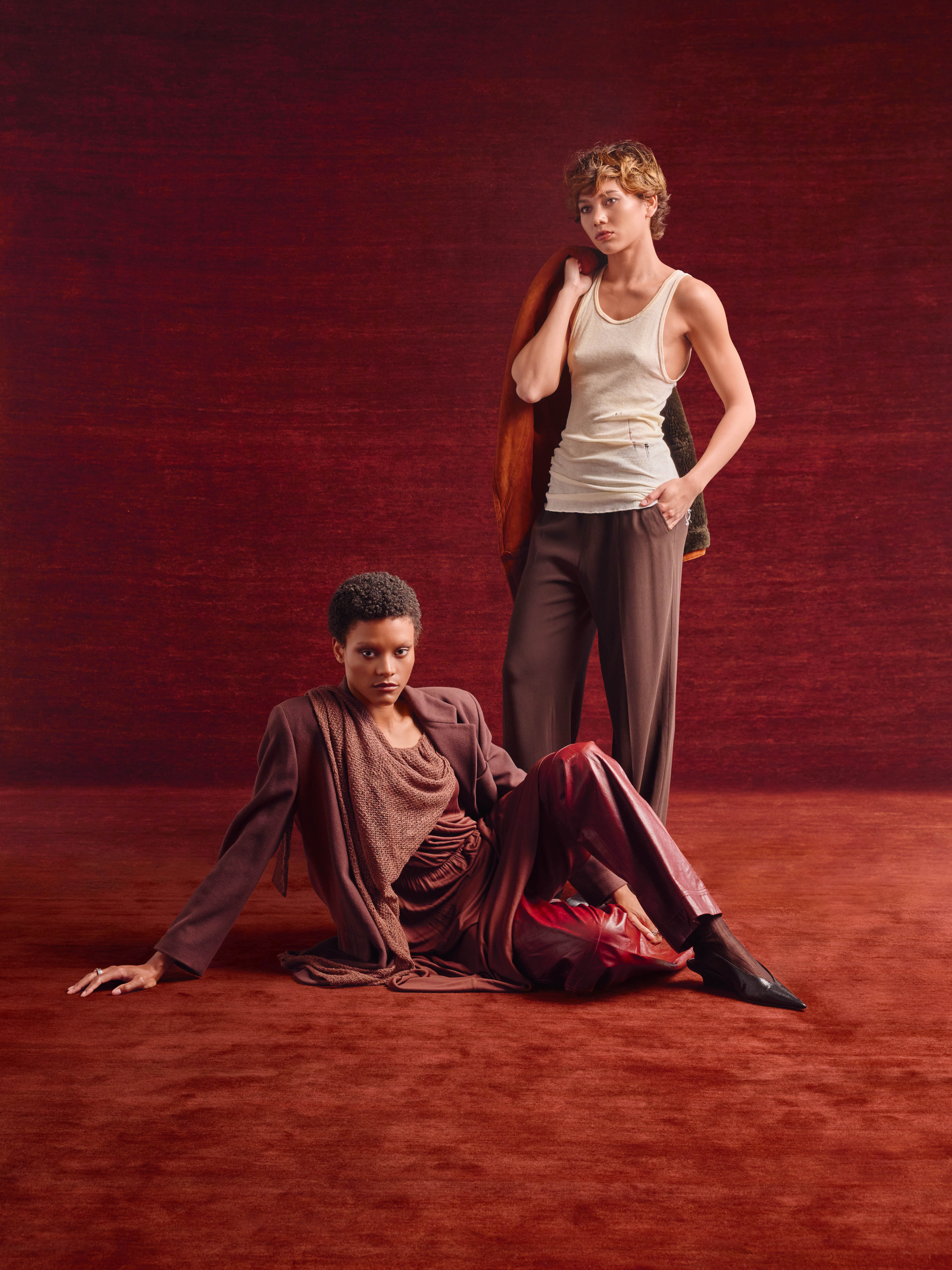 Agra rug in Burnt Umber by ARMADILLO. Seated model: ‘90s CALVIN KLEIN blazer. Callaghan by GIANNI VERSACE S/S 1977 dress. ‘90s Emporio ARMANI leather pants. Standing model: ‘80s genuine shearling coat. Vintage cotton tank. Y2k MAX MARA trousers. PRADA boots. Kiera shoes by TOTEME