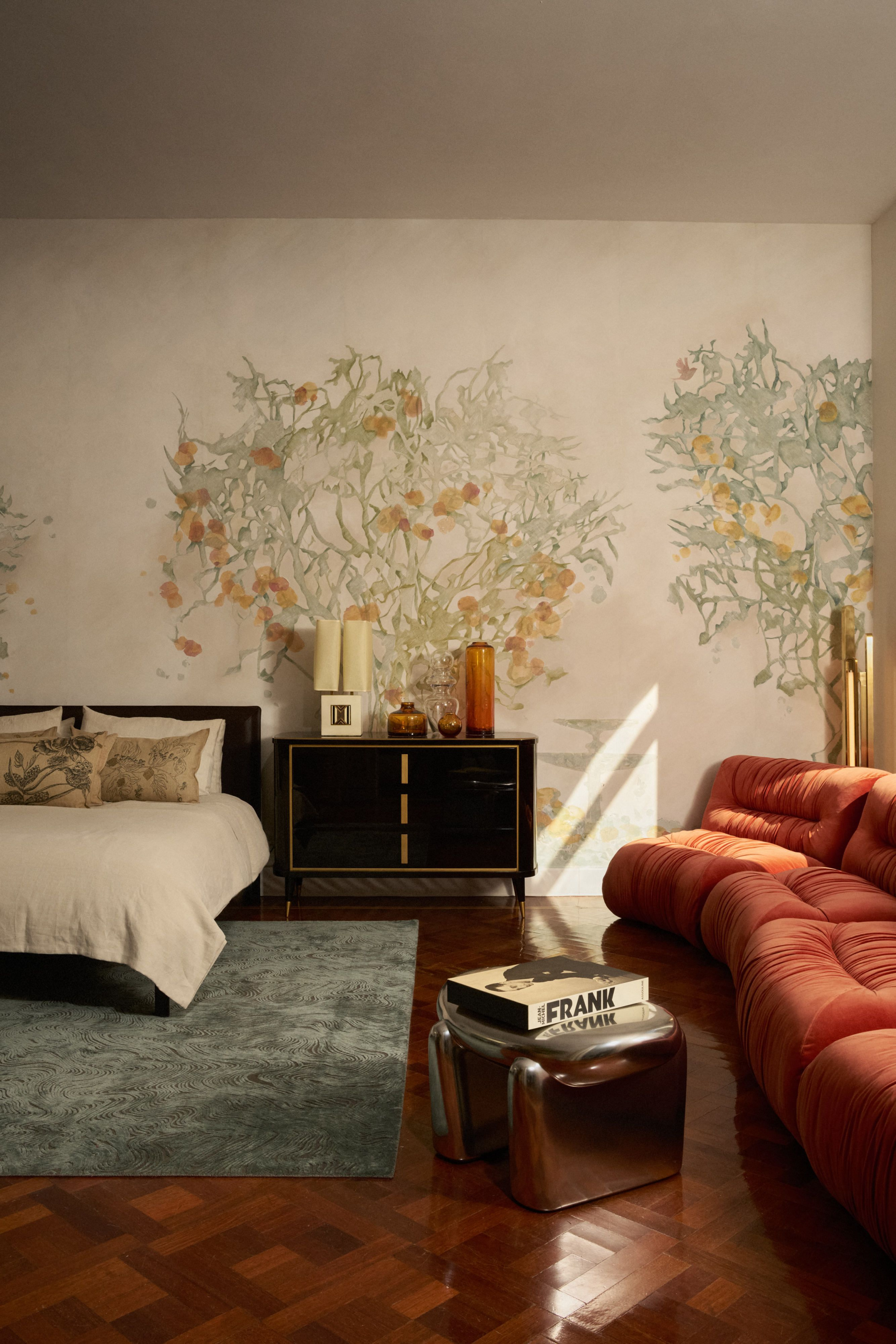 “The elegant and relaxed bedroom has a palette of reds, creams, and metallic tones,” she says. “A modernist bed frame is contrasted against a scenic handmade wallcovering of citrus trees in shades of green and yellow. A flowing natural linen bed cover drops to the deep red rug beneath, and friends can lounge around on the sinuous sofa of wrinkled vibrant orange velvet, legs kicked up on a sculptural silver-coated stool.”