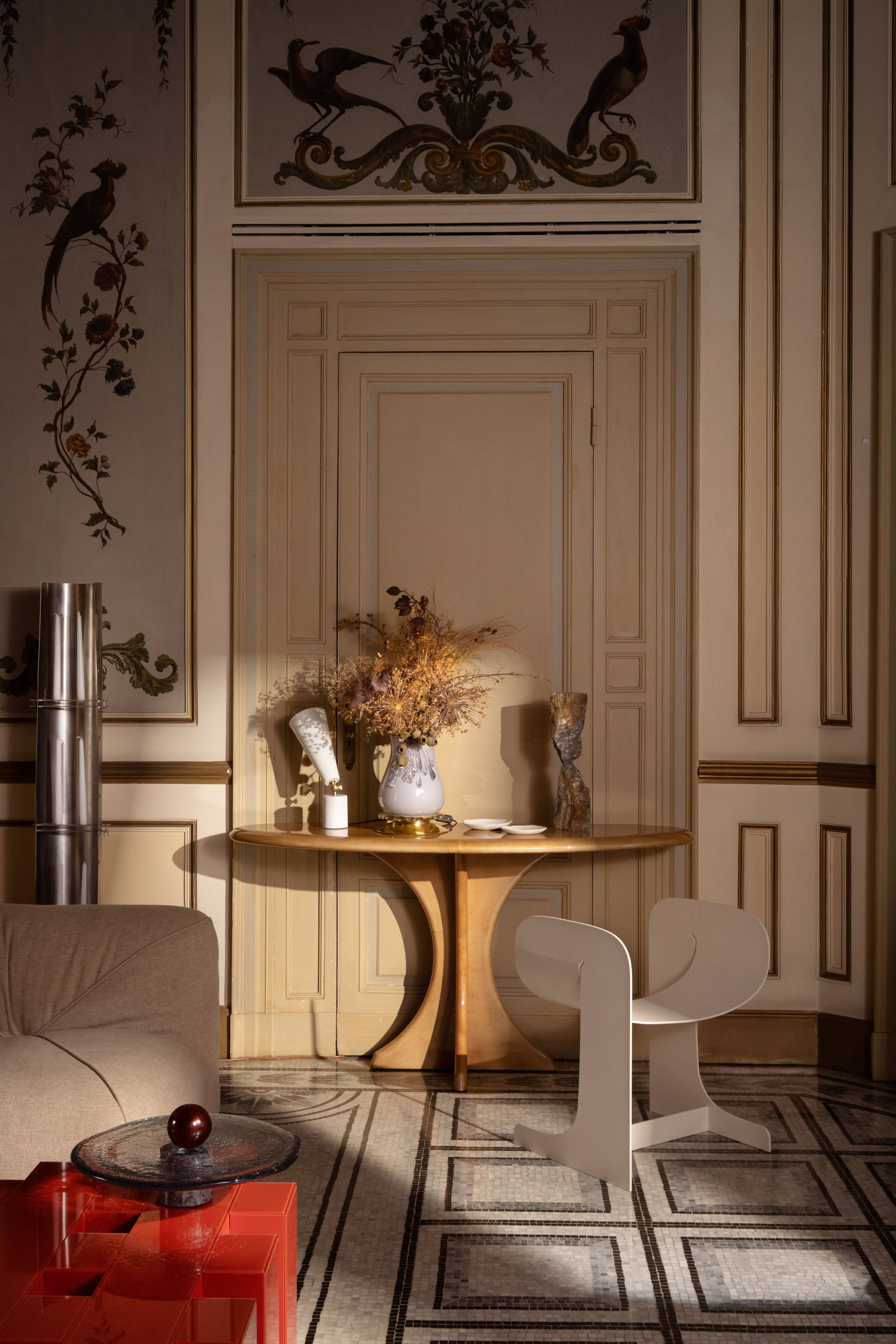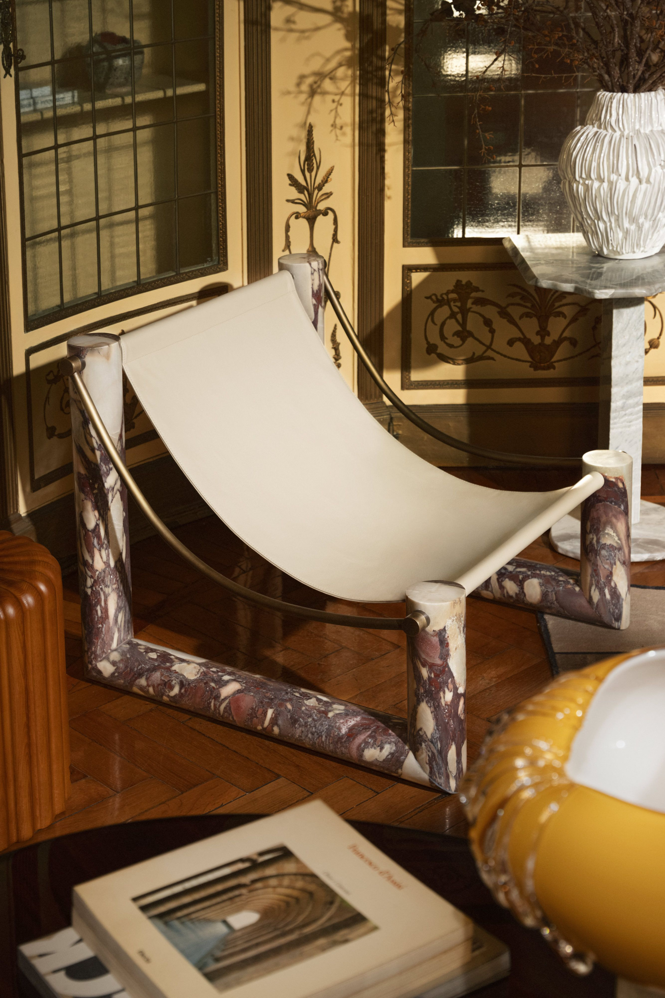 “A traditional desk layout felt too rigid,” she says. “Instead I introduced a more relaxed composition: a sculptural chaise at the center, surrounded by pieces that invite repose as much function. There’s a quiet confidence in resisting the conventional: bold forms against classical architecture, asymmetry over order.”
