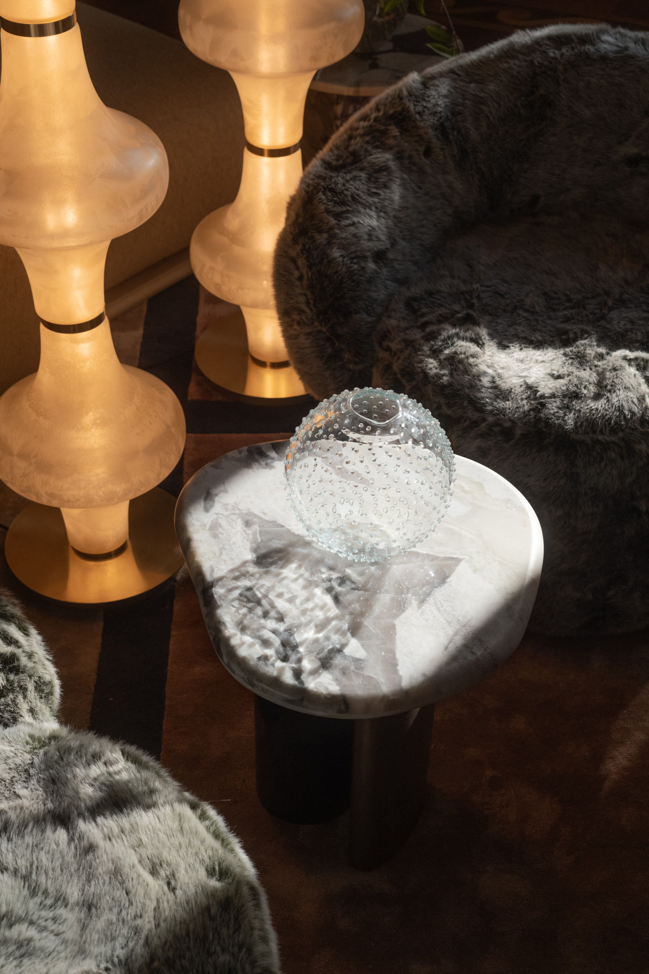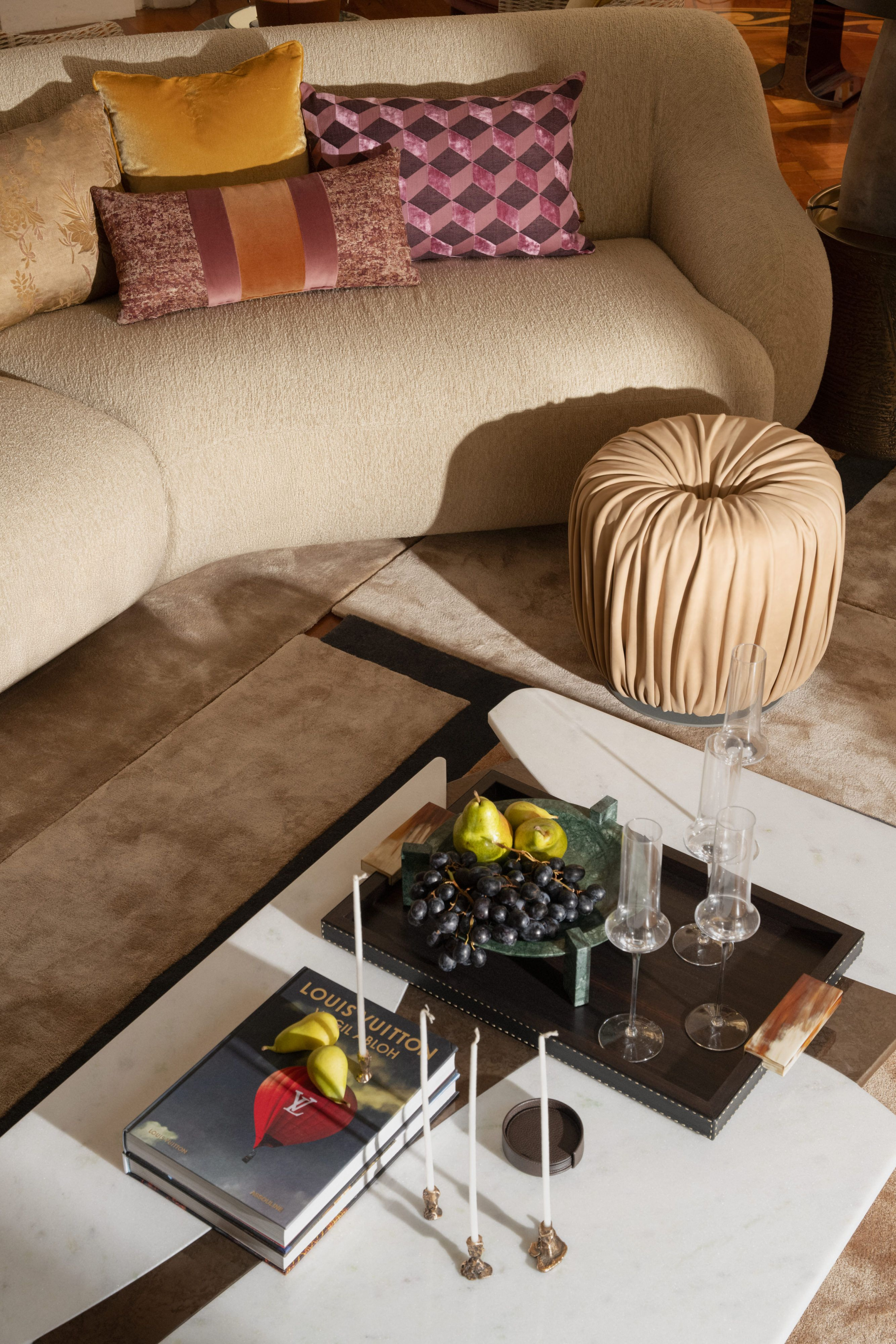 The palette also tells a story of subtle contrast and textural interplay. In her selection, Nebras was drawn to materials that hold timelessness: marble, leather, wood, brass, and hand blown glass.