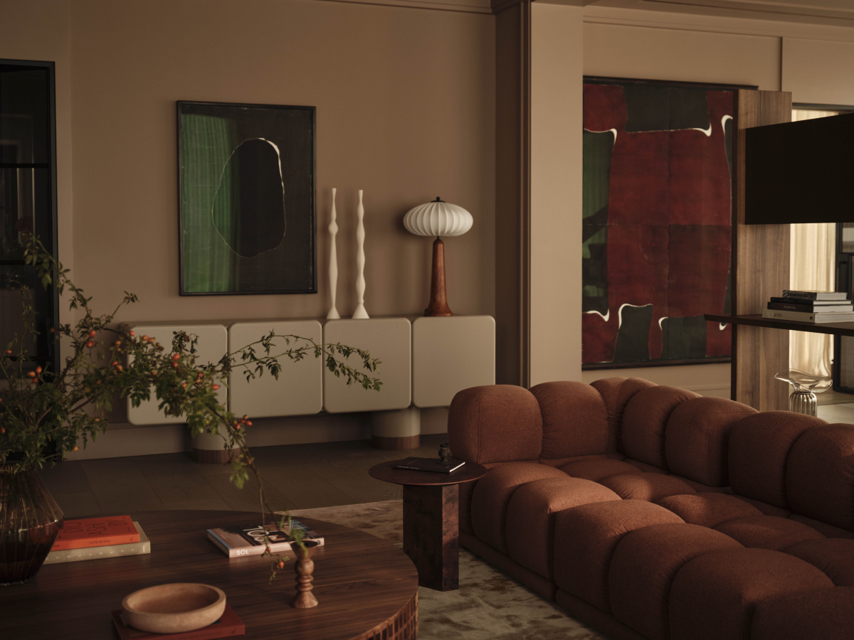 Curved seating in calm earth tones creates a cocooning living space layered with texture and light. Sculptural furniture, Murano glass accents, and tactile textiles bring warmth and depth to the area. Above: Carabottino coffee table by Medulum, Sacai sofa by Franco Ferri, Venus sideboard, by Ultraonbili, Imperfetto side table by Laura Meroni, Alfiere vase by Kose Milano, Mushroom lamp by Lampex Italia. Photos courtesy of Artemest