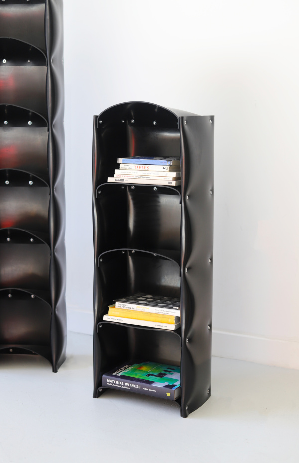 The group’s Rubber Libraries bookshelves consist of a black rubber sheet and aluminum rivets, nothing else. No hidden frame, and no metal armature doing the actual work. Just rubber cut and riveted like fabric, holding weight and functioning as furniture.