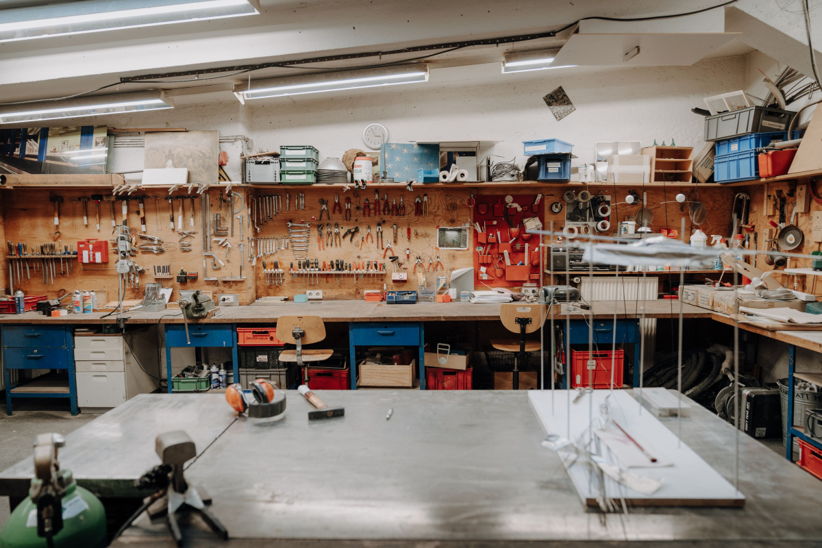But we don’t do that to create a “creative atmosphere”—it just happens because we start a lot of things, and sometimes we have to stop or change direction midway. We keep parts of those explorations around, either for later use or simply as reminders. The result is a sort of organized explosion of ideas and materials.