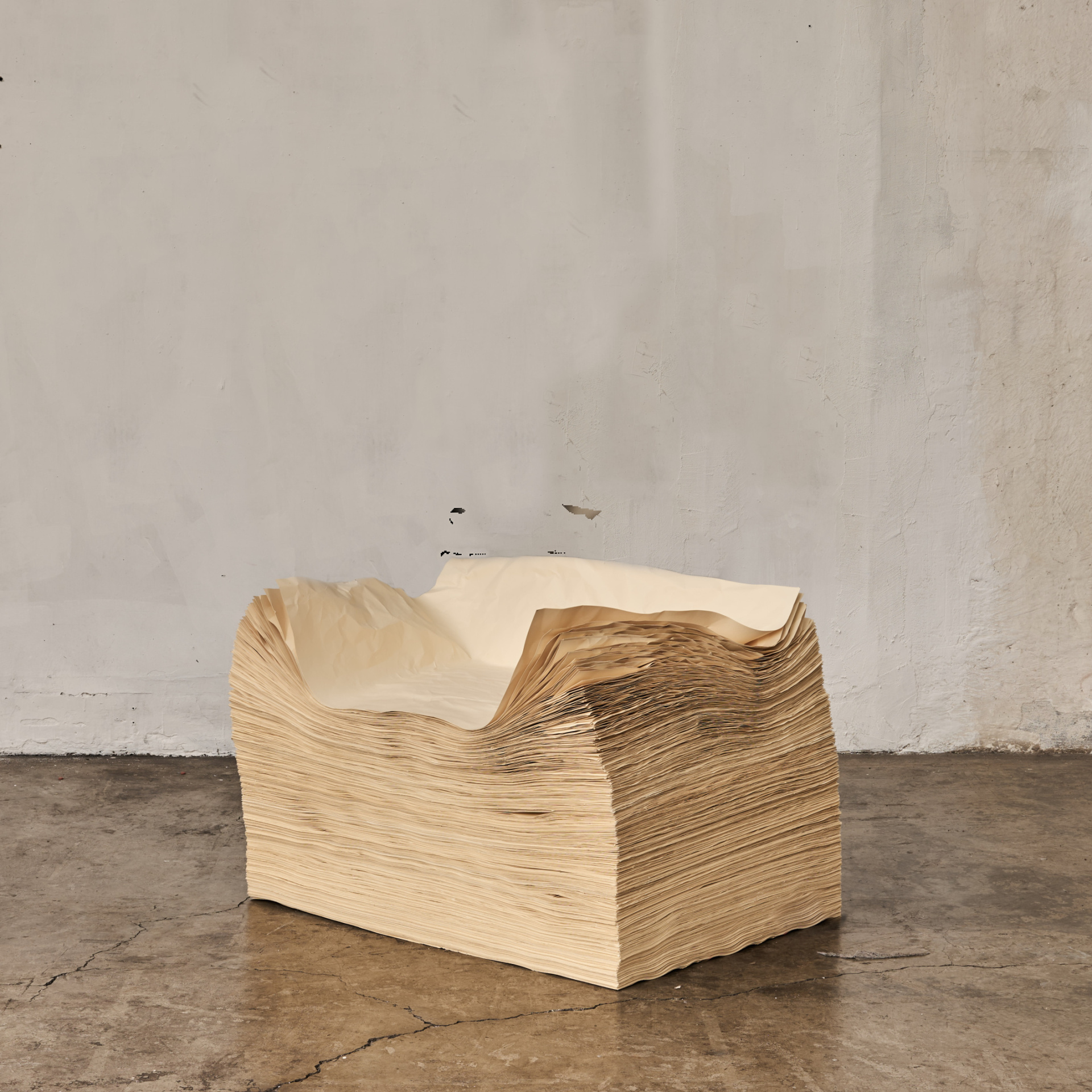 “I have been experimenting with paper for a long time,” he says. “It is probably the most ubiquitous material in the world over the last 1,000 years until the digital age. It immediately feels personal. As I generally do, I try to challenge and question the immediate feeling a material conveys.”