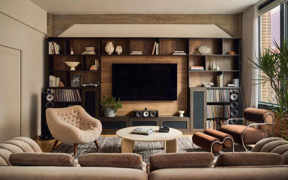 The living room features the Ellison Studios Float sofa, Chromeo chair and ottoman by DWR, and the Faroe rug from Armadillo. Bowers & Wilkins 702 S3 speakers add sonic depth, while the Rohde Easy chair by Herman Miller offers a sculptural touch. The Dumæ Giselle bowl and Jack Catchall decorates the bookshelf. Weaver coffee table and Taurus bowl by Jayson Home.