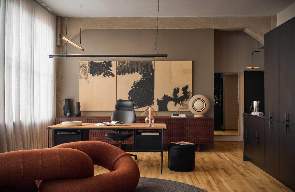 The Link sofa by Sancal sets a sculptural tone alongside the Oscar desk by Ethnicraft, Freedom chair by Humanscale, and Braid rug from Armadillo. Lighting by Marset—including the Fris pendant, Fragile table lamp, and Ginger wall pendant—adds warmth against walls painted in Car Coat by Tonester Paints. The Marantz Grand Horizon speaker brings high-performance sound, while the Lesire credenza from DWR provides storage. Finishing touches like the Squiggle pitcher by Sophie Lou Jacobsen, Roman vases by Polspotten, Mona vessel with metal ring by Dumæ, and a Round Hide pouf from Arhaus infuse the space with personality.