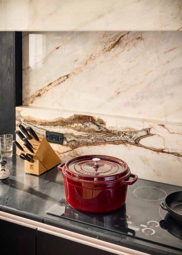 The Monogram induction cooktop is outfitted with Staub’s cast iron cocotte, frying pan, and Zwilling knife block set. Calacatta Onyx stone by Calia. Salt and pepper set by Normann Copenhagen.