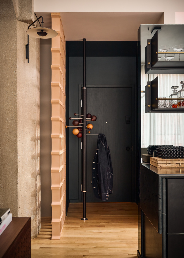 Hardwood floors were refinished with a suite of Bona waterborne products. A Wow Design partition adds texture and defines the space. The Tecno AT16 coat rack by Osvaldo Borsani from Artemest references the solar system, while a compact home bar includes a Monogram refrigerator and Buster & Punch shelving. Heta box by Jayson Home.