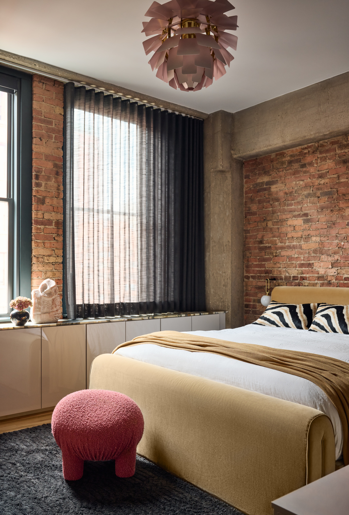 The bedroom’s design revolves around an anniversary-edition Artichoke lamp by Louis Poulsen. “It’s one of those pieces I’ve always loved,” Chris says. “When I heard they were releasing an anniversary edition I knew I wanted to build the room around it.”