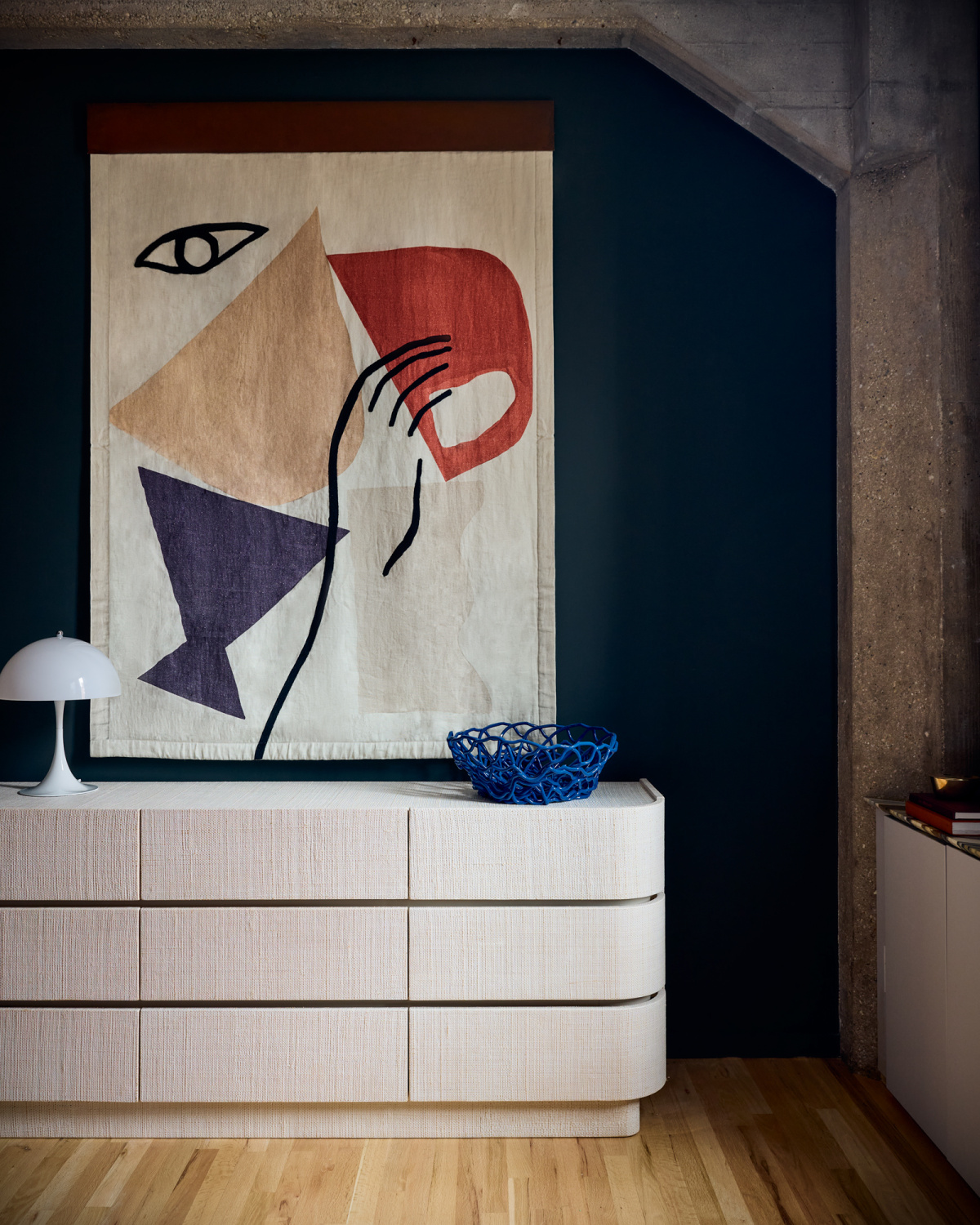 - Additional touches include the West Elm dresser and Panthella light by Louis Poulsen, alongside design favorites from Artemest—a Gaetano Pesce basket and Studiopepe wall hanging. A Tonester Paints Oliveblack wall softens the space.