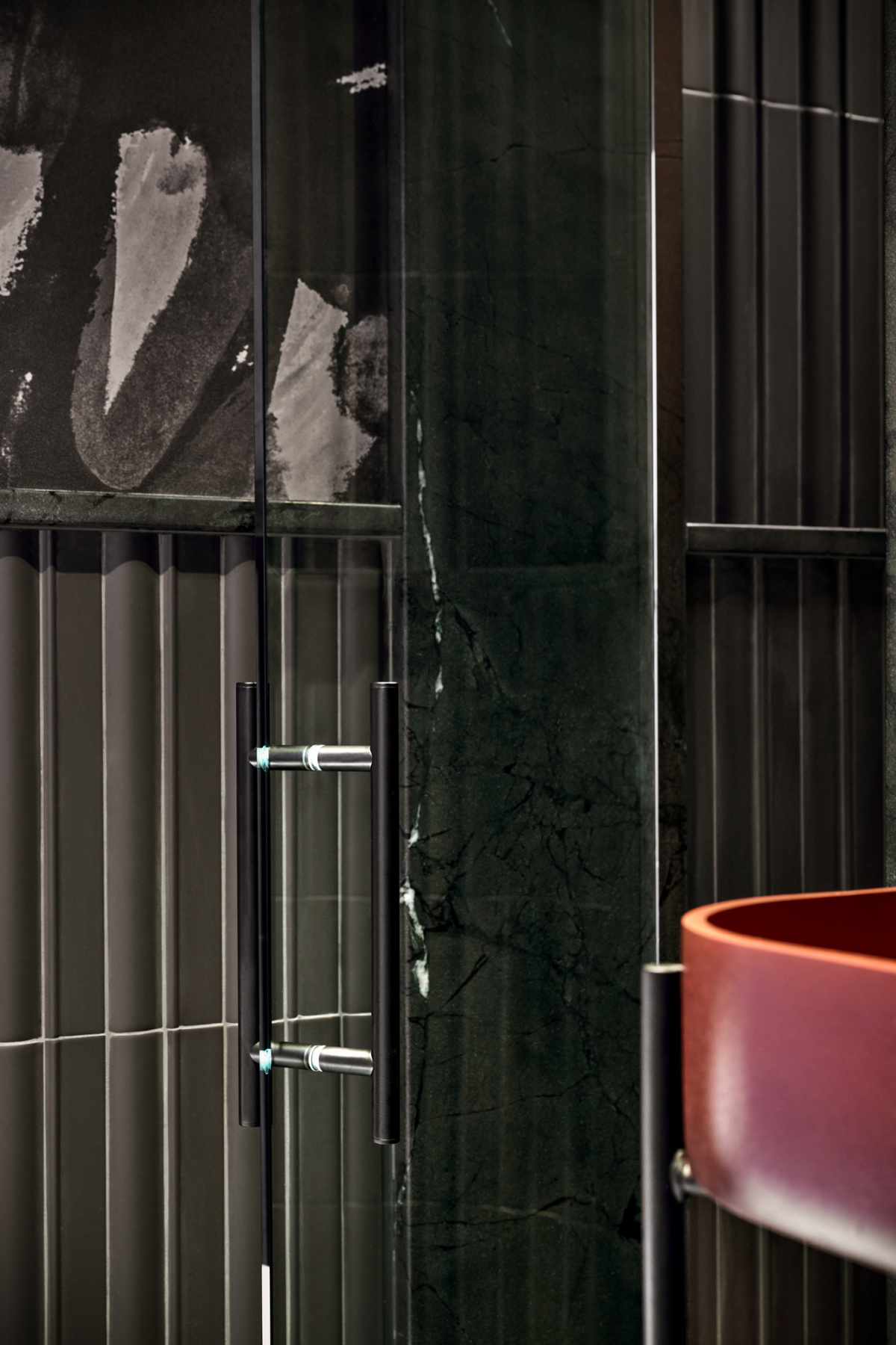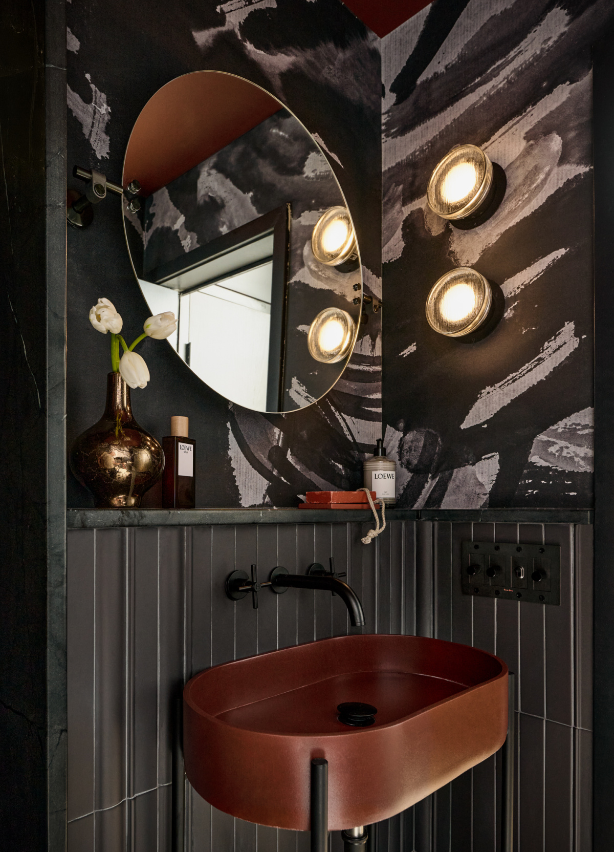 A concealed bathroom off the kitchen provided an opportunity for bold design choices. “We wanted it to feel like a secret room, and to do something fun and interesting here for when you do finally discover it,” he says.