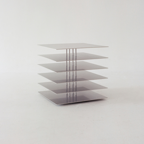 Ford took that idea and rebuilt it as a stainless steel side table. Flat metal plates stack at different heights connected by thin vertical posts. Depending on the angle, a trick of the eye makes those posts seem to vanish. Suddenly you’re staring at shelves floating in space with no visible means of support.