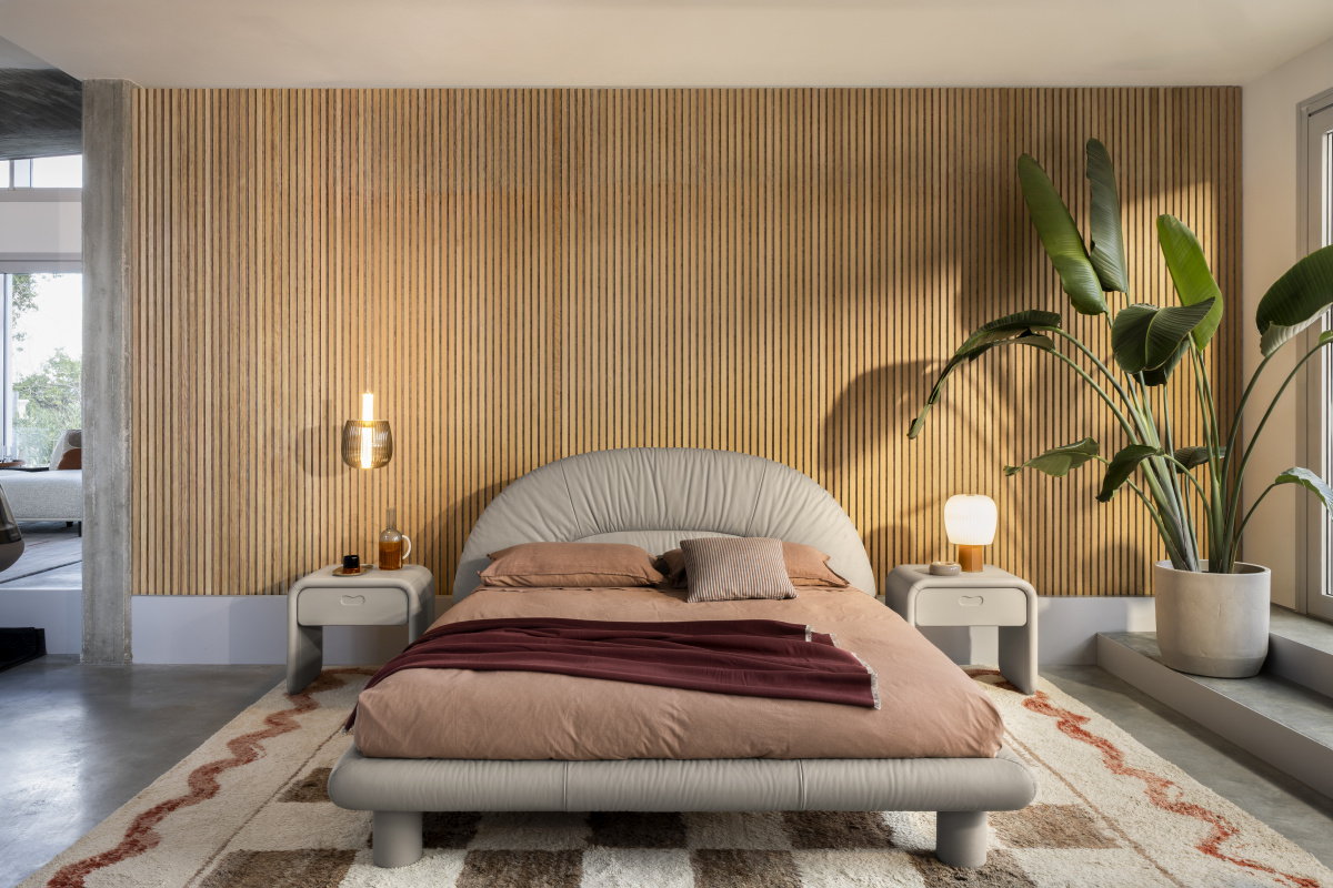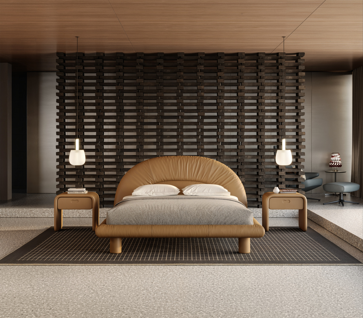 The LieLow bed and nightstands by Faye Toogood for Poltrona Frau. The bed’s curves echo Renzo Frau’s own Vanity Fair armchair, and the wide headboard nods to Tito Agnoli’s Rondò, both pulled from the brand’s archive in Tolentino. Image courtesy Poltrona Frau