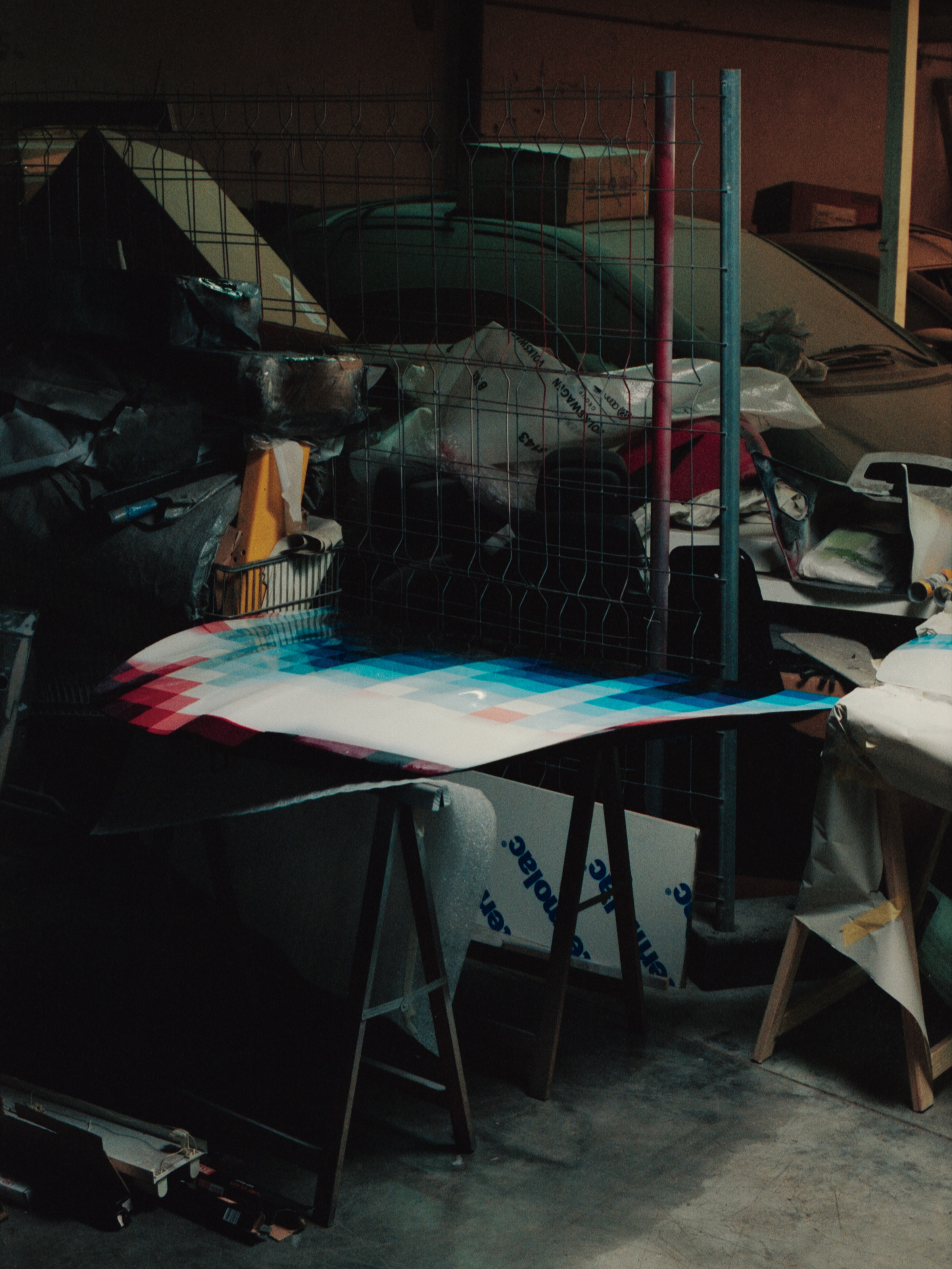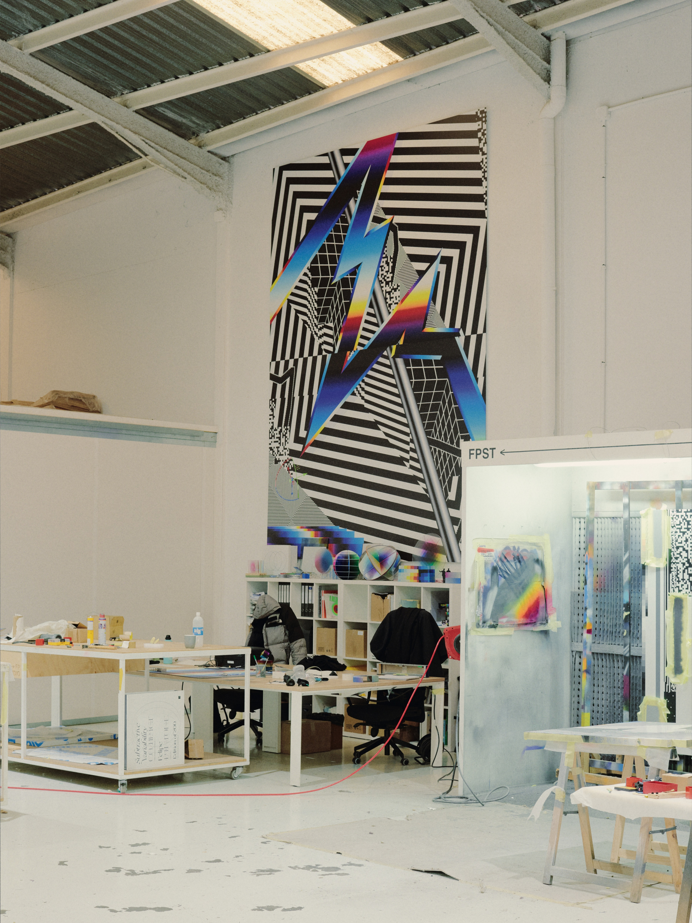 - Colorful grids, stripes, and checkerboards dominate Felipe’s studio alongside ink jet printers, CNC mills, and assorted machinery. Photo by Luis Ayor