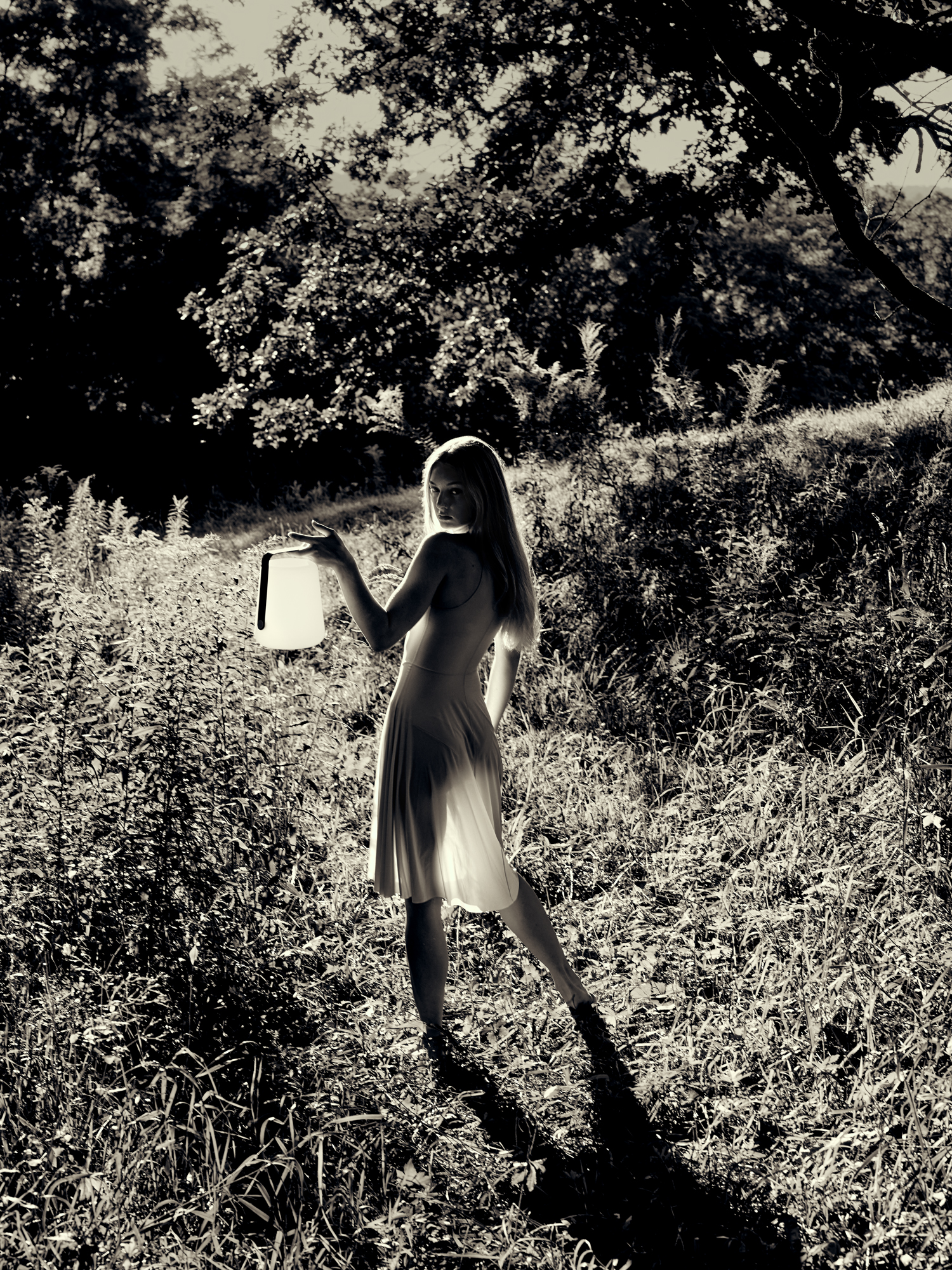 Holding the Balad lamp by FERMOB, she carries the essence of summer evenings. Dress by Skims