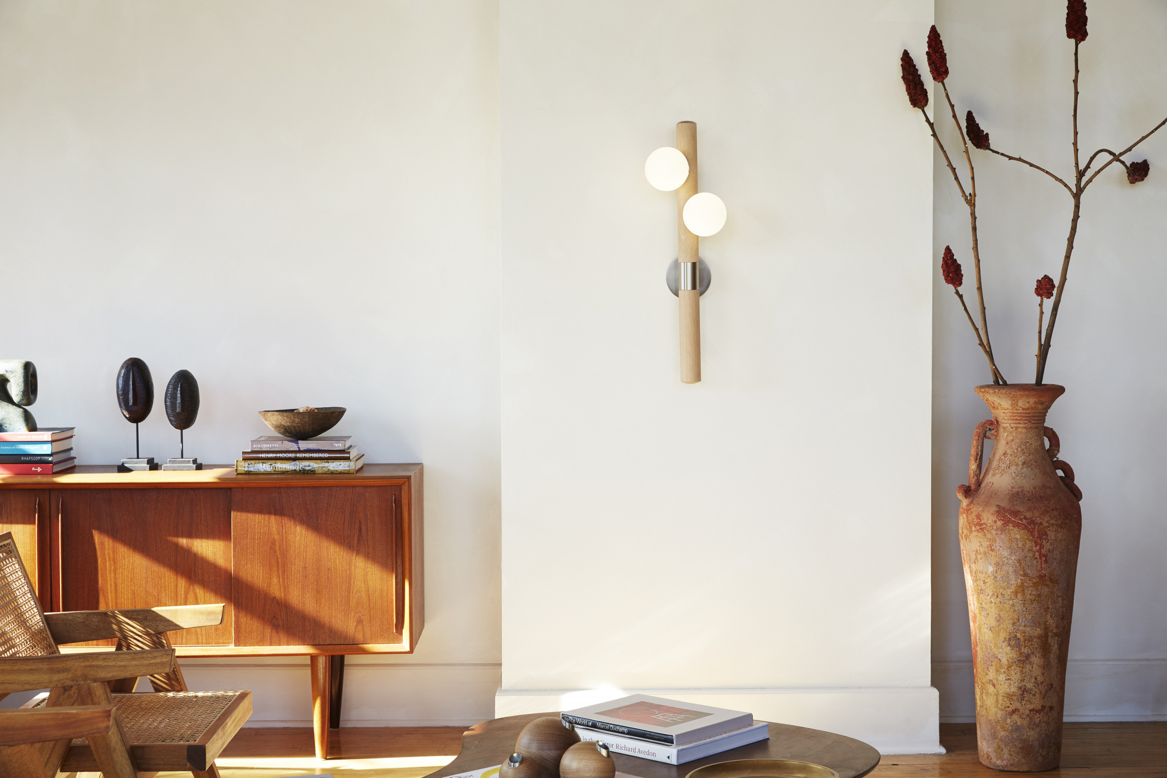The Willow Sconce (shown here in oak) showcases the interplay of blown glass, metal and wood and the precision of their connections. Photos courtesy of hollis+morris