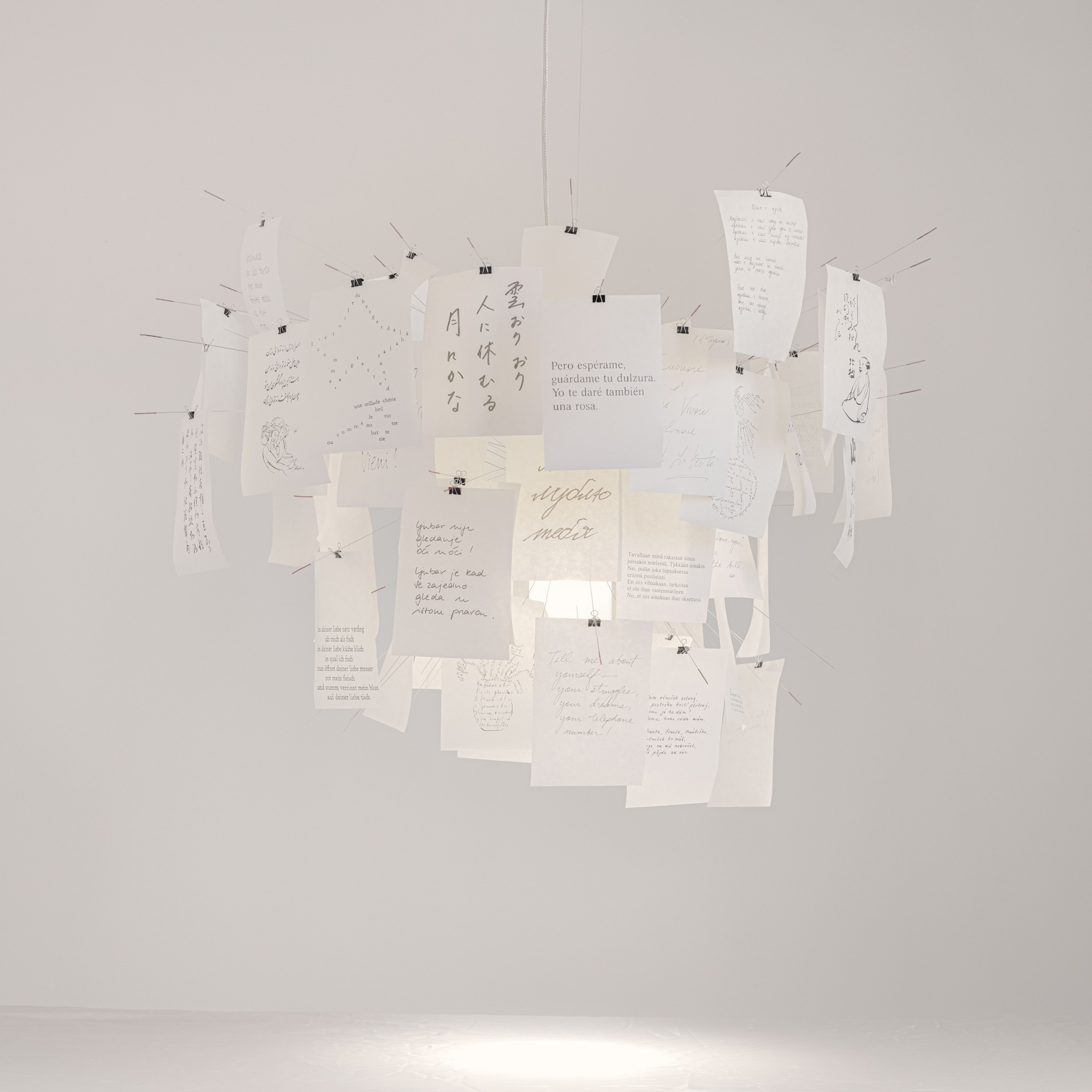 Ingo Maurer’s Zettel’z hanging lamp, a defining work of contemporary design, was a featured highlight in MoMA’s upcoming exhibition “Pirouette: Turning Points in Design” in January 2025. Paola Antonelli, MoMA’s senior curator of the department of architecture and design and director of research and development, refers to Ingo as a “titan of design.” “Zettel’z represents him in all his rebelliousness, humor, and generosity,” she says. “Zettel means ‘note’ in German, and indeed the lamp comes with dozens of sheets of fine Japanese paper. Some are filled in, and others are ready for the new owner’s own creative initiative—favorite quotes, friends’ messages, sketches, or more—which are clipped in to form a unique and personal cloud. As often with Ingo’s work, the design process never ends to surprise.”