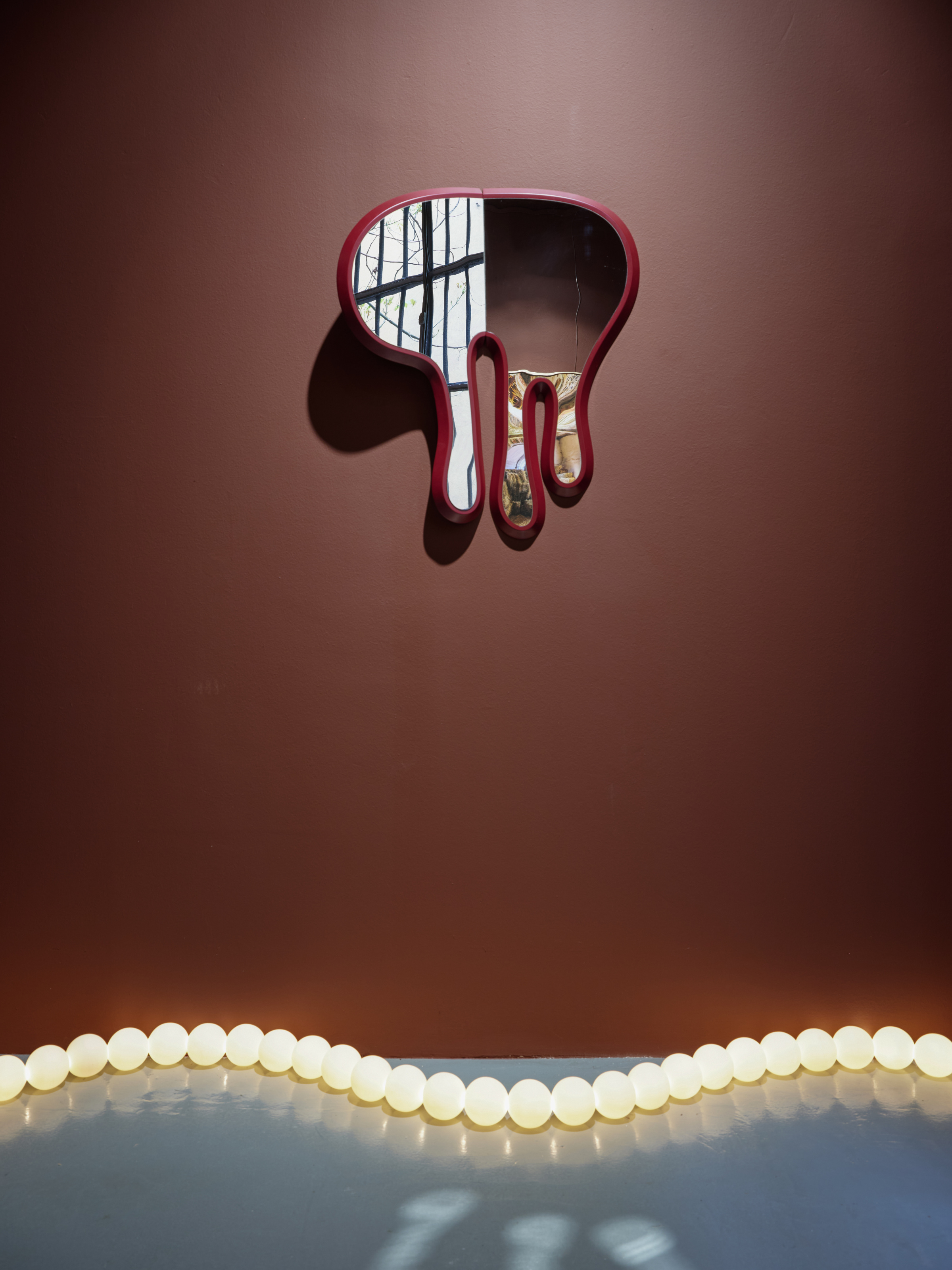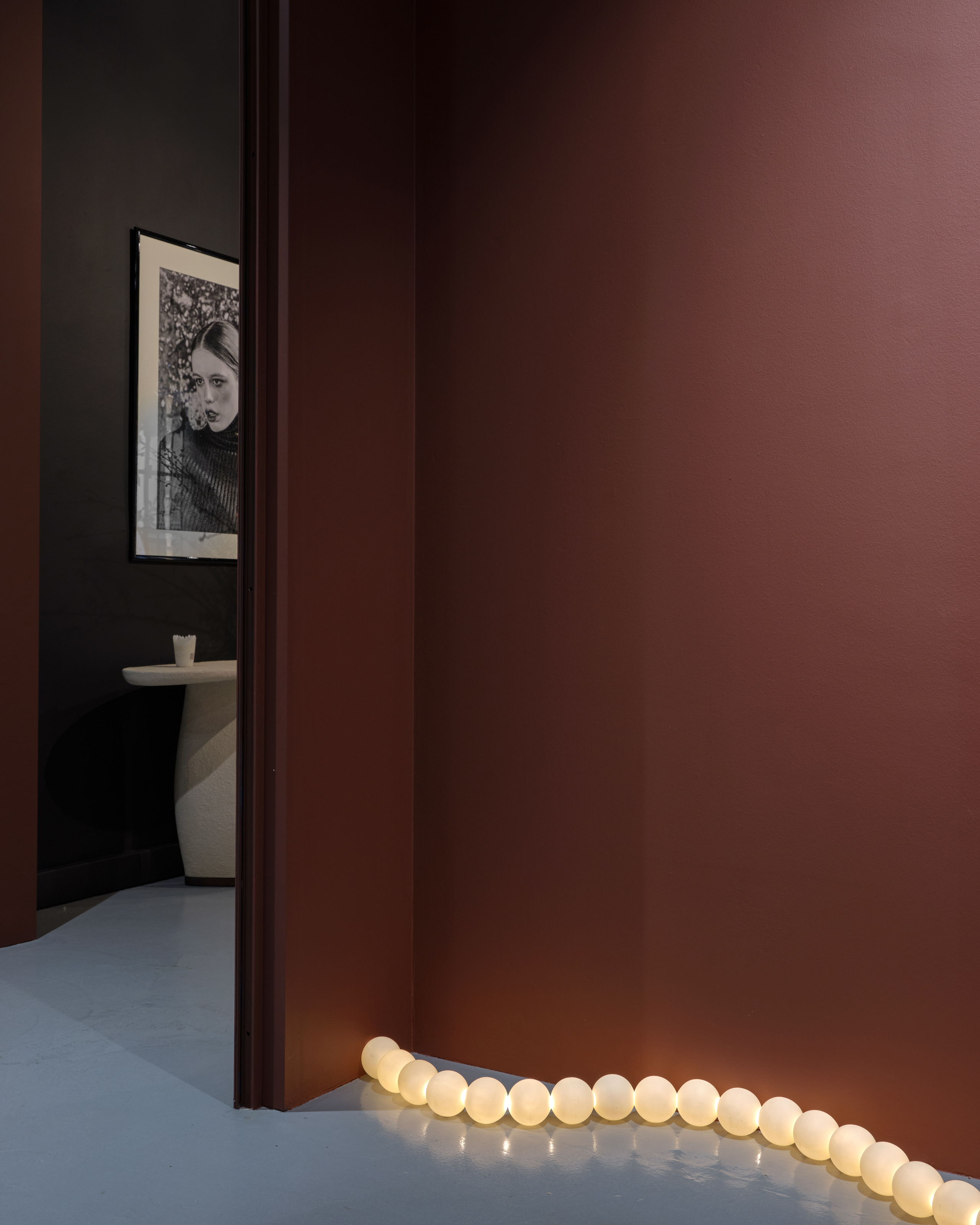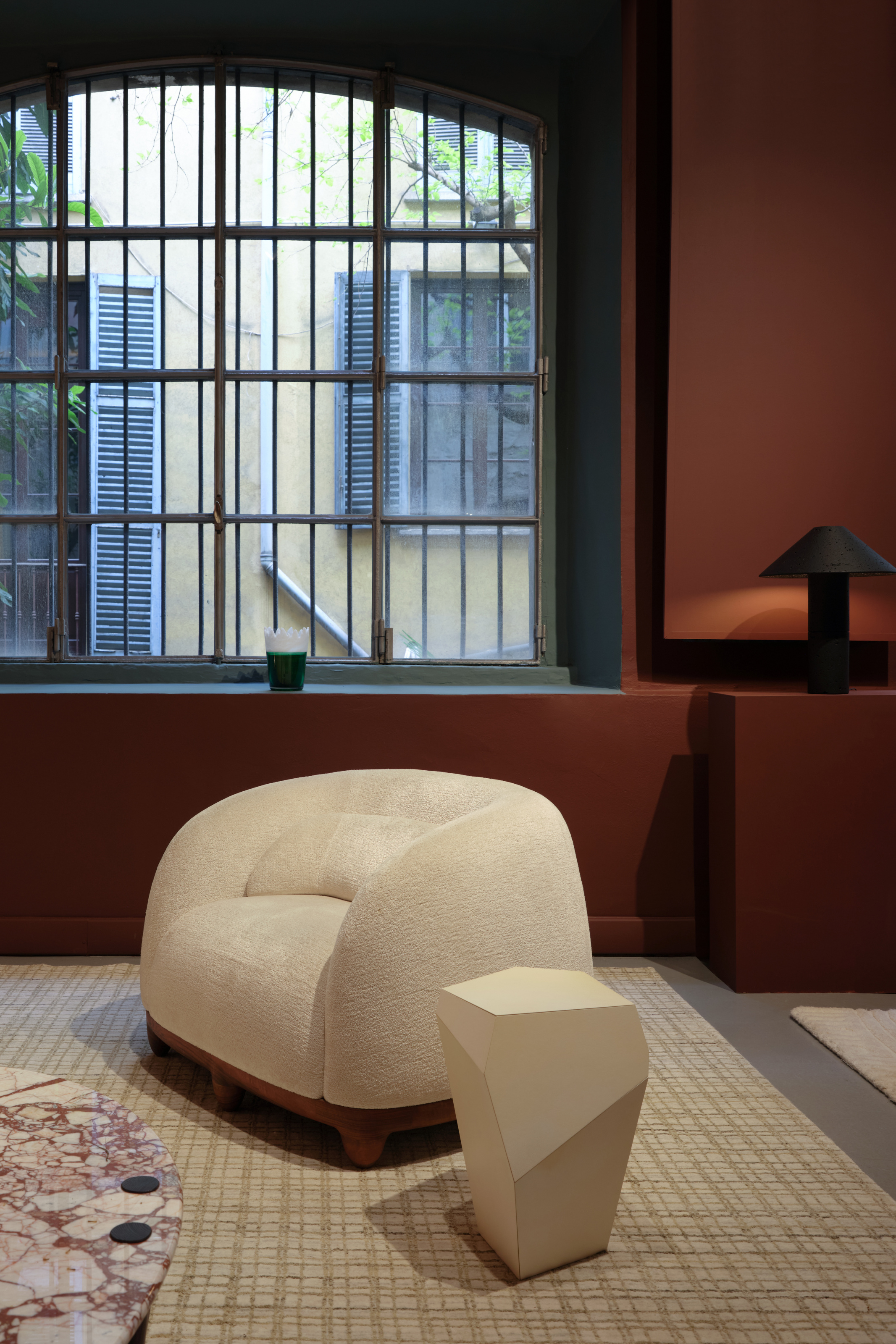 - The designers’ works were brought to life through a color palette inspired by the streets of Milan, courtesy of Tonester Paints. Collier de Perles lamp by Franck Genser.