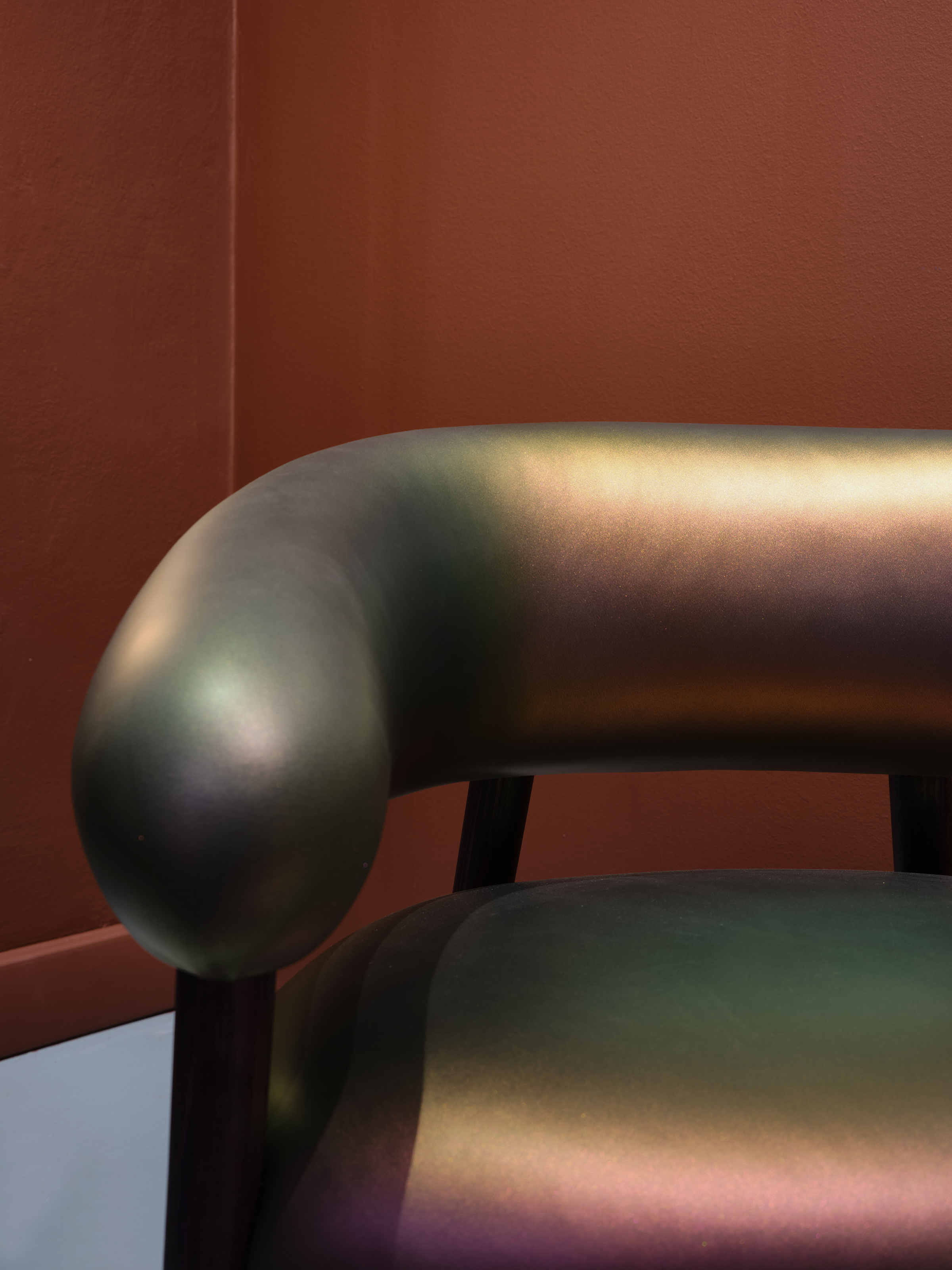 “The inspiration for the texture of the chair’s material actually came from the skin of an apricot,” Franck says. “We used a shiny neoprene material that you similarly see in swimming clothes—the ones you zip up and wear in the sun. The fabric is made in Japan and reacts very well to sunlight. It also stretches over the chair seamlessly so there is no visible stitching.”