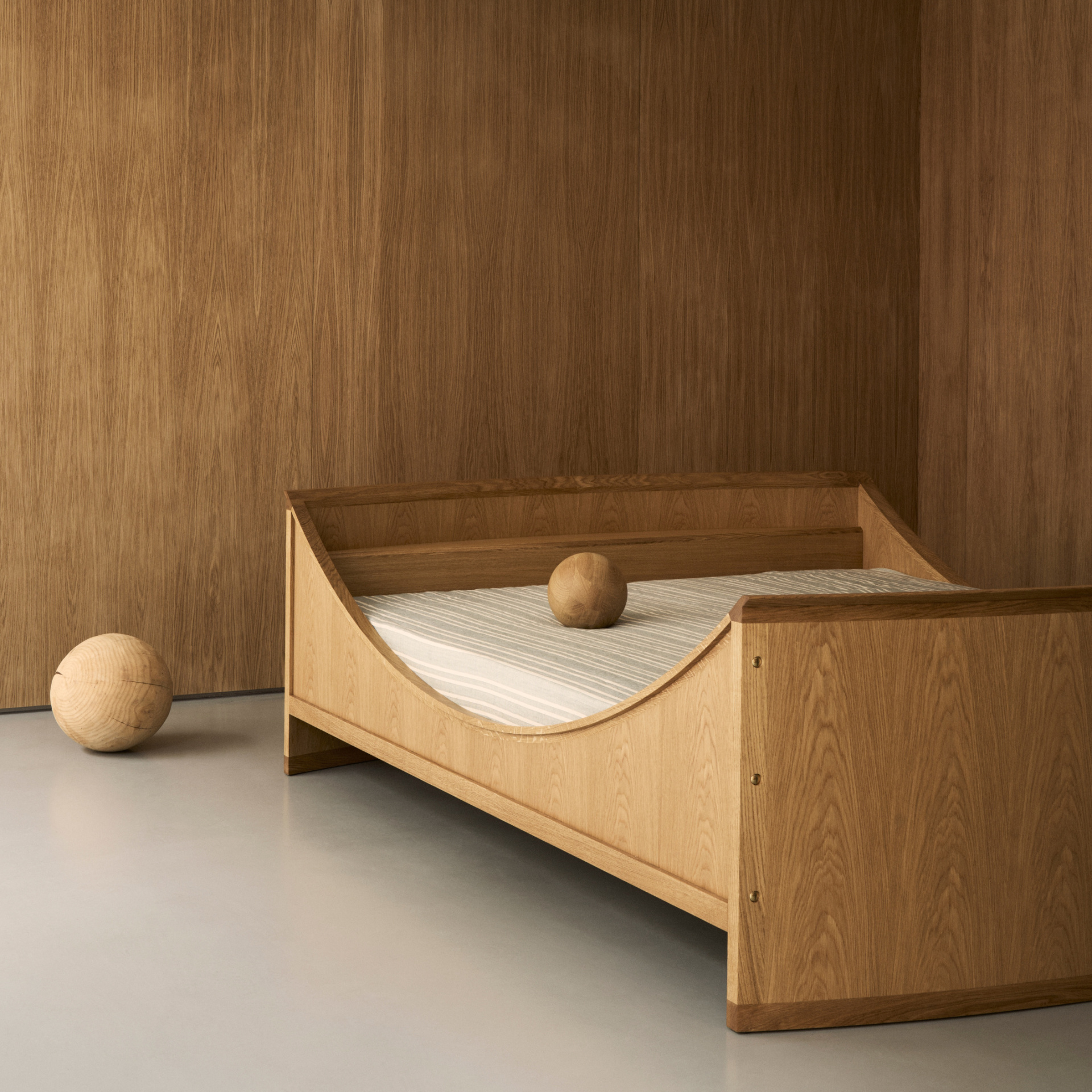Described as “a mathematical stroke of genius,” the space between the Spherical Bed’s headboard, footboard, and sides follow the shape of a fictitious sphere, mirroring its rounded edge. Expanding to a double size would be a careful process. “Once we could calculate the one-person bed’s geometric shapes, we had to pull the dimensions outward,” Jeppe says. “It was nerve-racking,” Martin admitted, describing the pressure to maintain the original bed’s essence while evolving it for contemporary tastes. “Before launching the double bed we hoped people would love it as much as we do. We even consulted the Klint family for approval.”