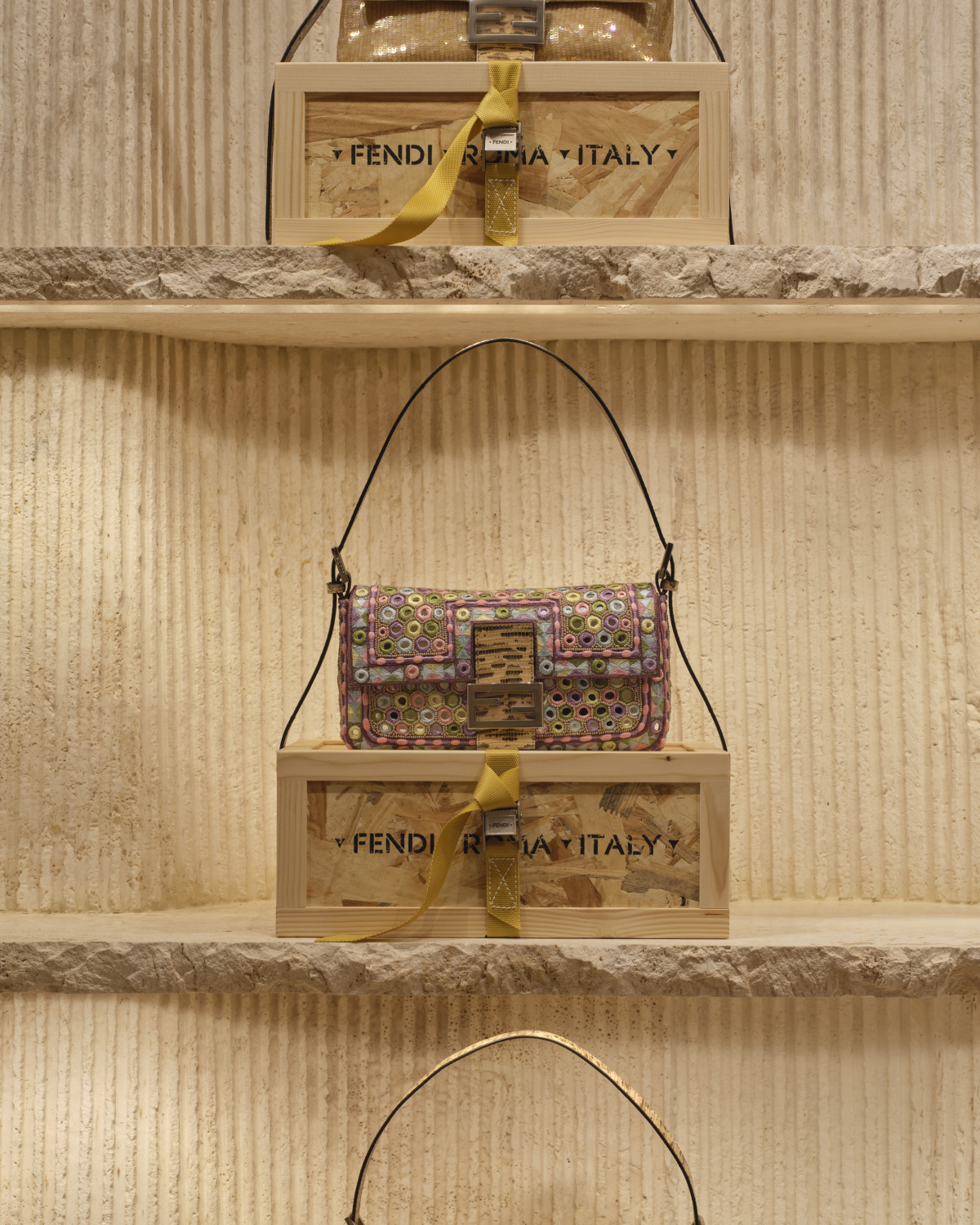 The Baguette 26424 Re-Edition packaging at Palazzo Fendi Milano. Each bag ships inside a stenciled canvas sleeve, then into a wooden crate, staged to position the re-edition as a collectible object as much as a handbag. Photo by Chris Force