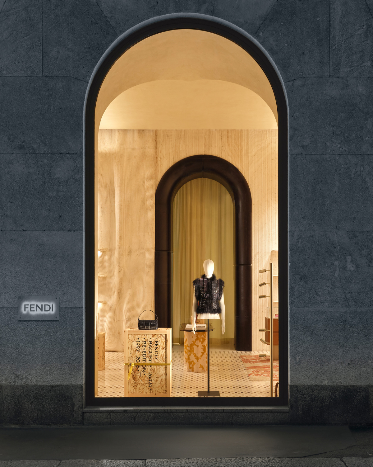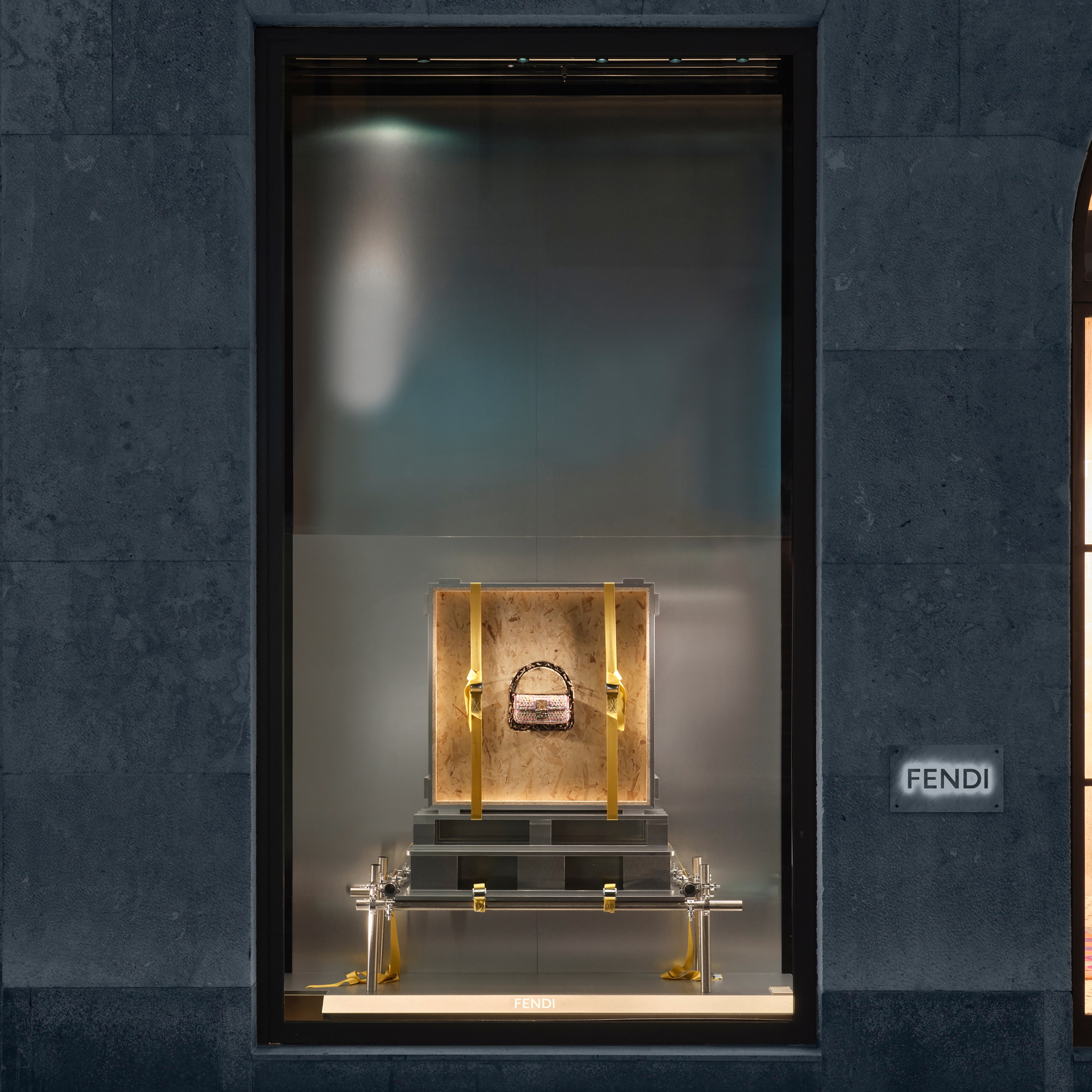- One of the 20 Baguette 26424 Re-Editions, staged ontop its stenciled wooden shipping crate on the ground floor of Palazzo Fendi Milano. Photo courtesy of Fendi