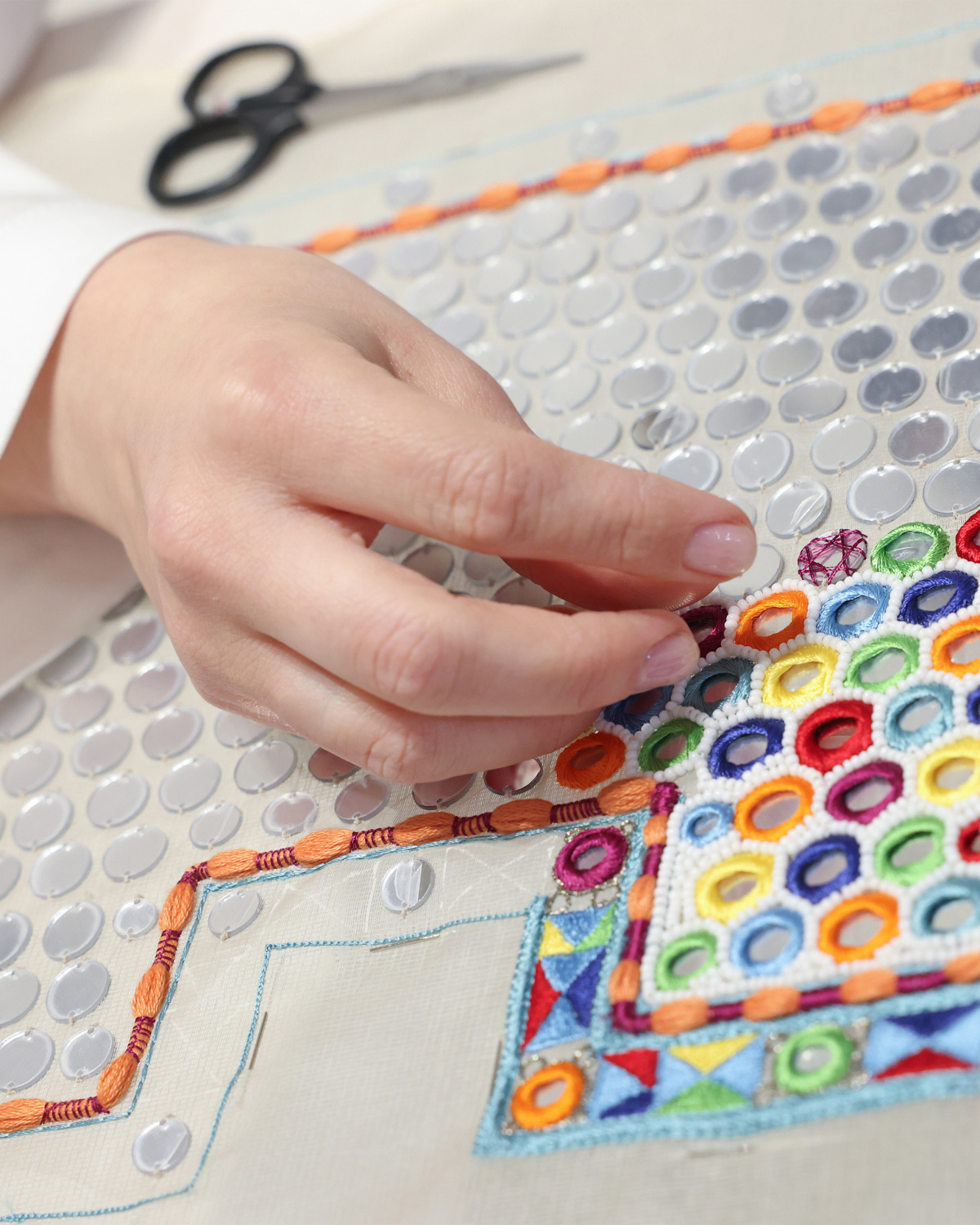 - Artisans at work on the Baguette 26424 Re-Edition inside the 3rd floor atelier at Palazzo Fendi Milano. Above: mirrored-sequin embroidery in progress.