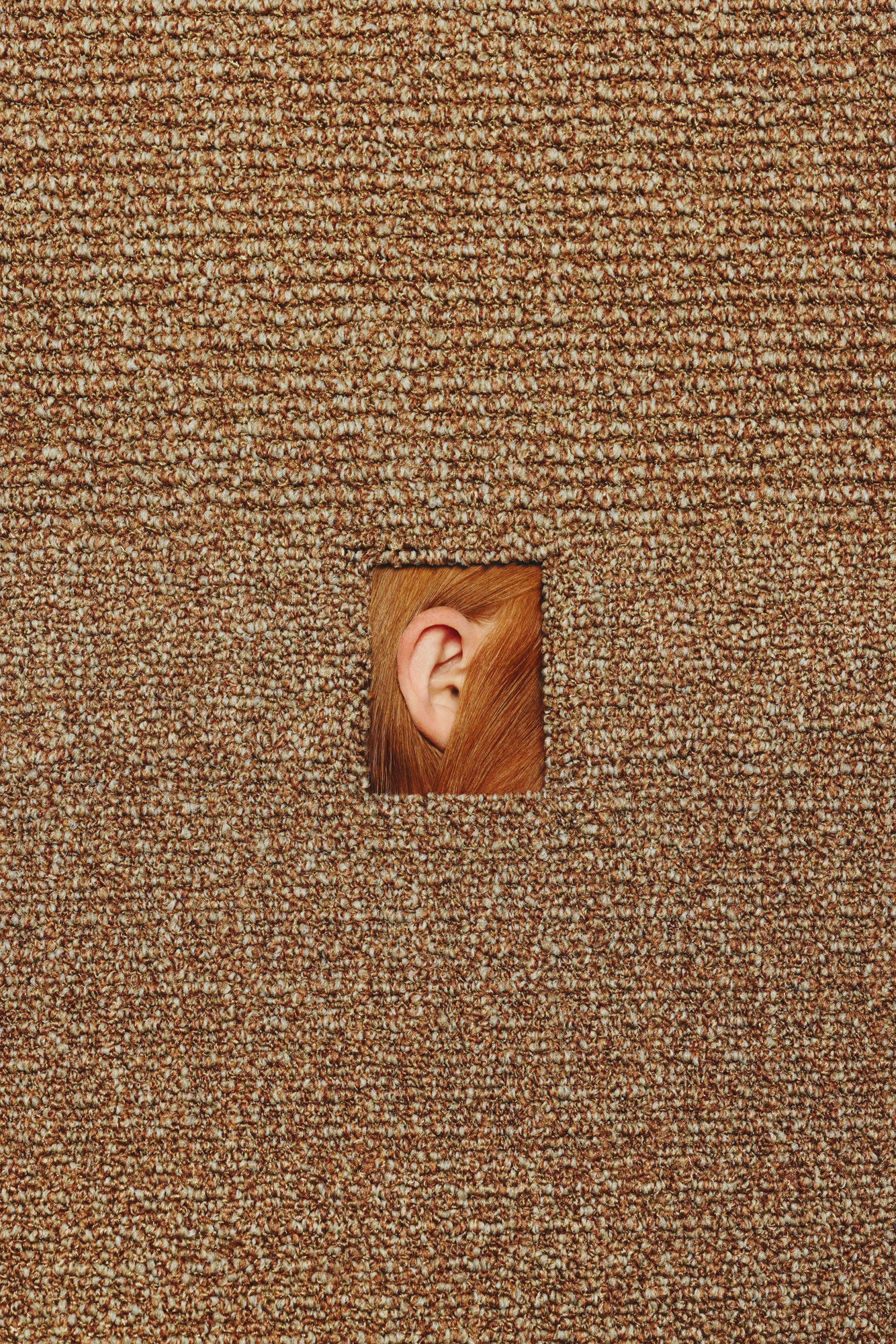 ← SOUND. An ear emerges through Dimensional Fade in Molten Sienna from MOHAWK GROUP, listening through layers of tufted texture. Sound finds its way through rust and cream fibers where the carpet’s dense, tactile surface both muffles and frames what can be heard beneath.