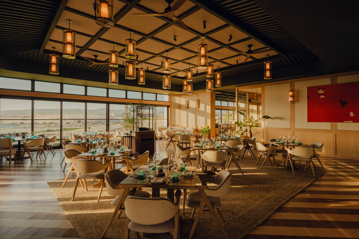 The interiors, designed by Studio PCH, blend Japanese minimalism with the raw beauty of local Mexican materials. Led by French architect Séverine Tatangelo, the California-based boutique firm specializes in designing social spaces with a focus on high-end hospitality and residential projects. At Nobu Los Cabos, Cabo stone, granite, and limestone work together in simple lines and light tones, creating spaces that are both sophisticated and comfortable. The architecture, designed by the Honolulu-based firm WATG, also draws inspiration from the raw beauty of the surrounding desert. Native plants like palo blanco, elephant tree, and agave ensure harmony with the desert environment.