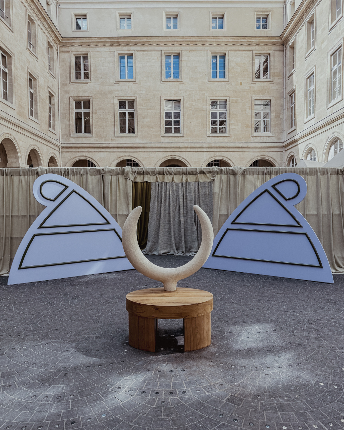 At the Hôtel de la Marine, Jérémy Pradier-Jeauneau’s LE LABYRINTHE was his first large-scale solo project. The installation ran in three parts: a courtyard maze marked by wing-shaped doors with a dramatic entrance courtesy of the YUNOS lamp by Fermob. Inside eight podiums in the ceremonial salons paired fashion and design including a horned Minotaur throne by Philippe Hurel, and an exhibit where resin and plaster figures draped in Maison Élitis textiles face the square.