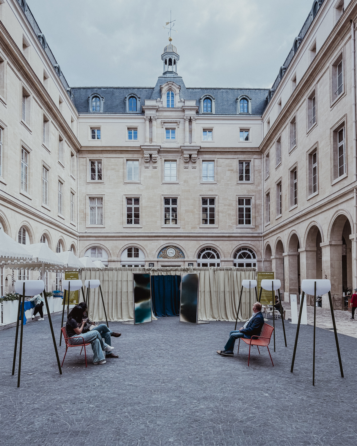 On the terrace of the seventeenth century Hôtel de Sully, designer Lucas Huillet and perfumer Alexandre Helwani presented “Folie,” an installation about mental health. Visitors were invited to recline on a sofa, look up at bright fabric forms, and breathe perfumes created with Amandine Clerc-Marie, lead perfumer at DSM-Firmenich, the world’s largest privately held fragrance company. The setup followed a familiar design week formula: a handful of simple, colorful objects set against a historic courtyard. When I visited, the promise and the reality did not match; the platform read unfinished and the sofa felt casually assembled rather than crafted which undercut the idea of comfort and care. In a city full of exceptional furniture, it looked out of step. Scent was meant to be central, but it was missing that day.