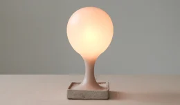 “A lot of the pieces in the collection are influenced by tension,” says Alex. “Pairing hard angular forms with soft or delicate material and seeing how those two opposing sides work together and generate an emotive response.” The rigid metal frame plays against glass with soft edges and color variations, creating a contrast that shifts depending on whether the lamp is on or off.