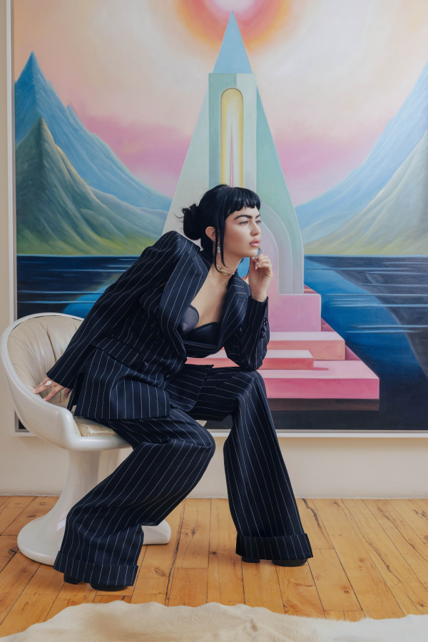 A large-scale painting from Pilar’s “Altars and Portals” series titled “Sympathetic Resonance.” Suit, top, and jewelry by Dolce & Gabbana