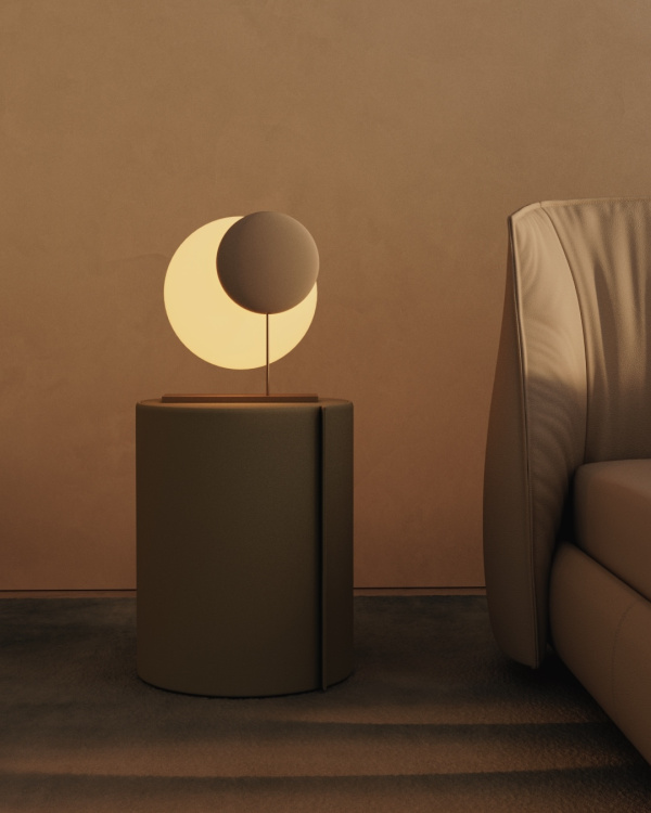 The Moonbeam lamp evokes a solar eclipse, with a luminous pearl-white glass disk partially eclipsed by a slender metal plate in brass or Pelle Frau leather. Photo courtesy of Poltrona Frau