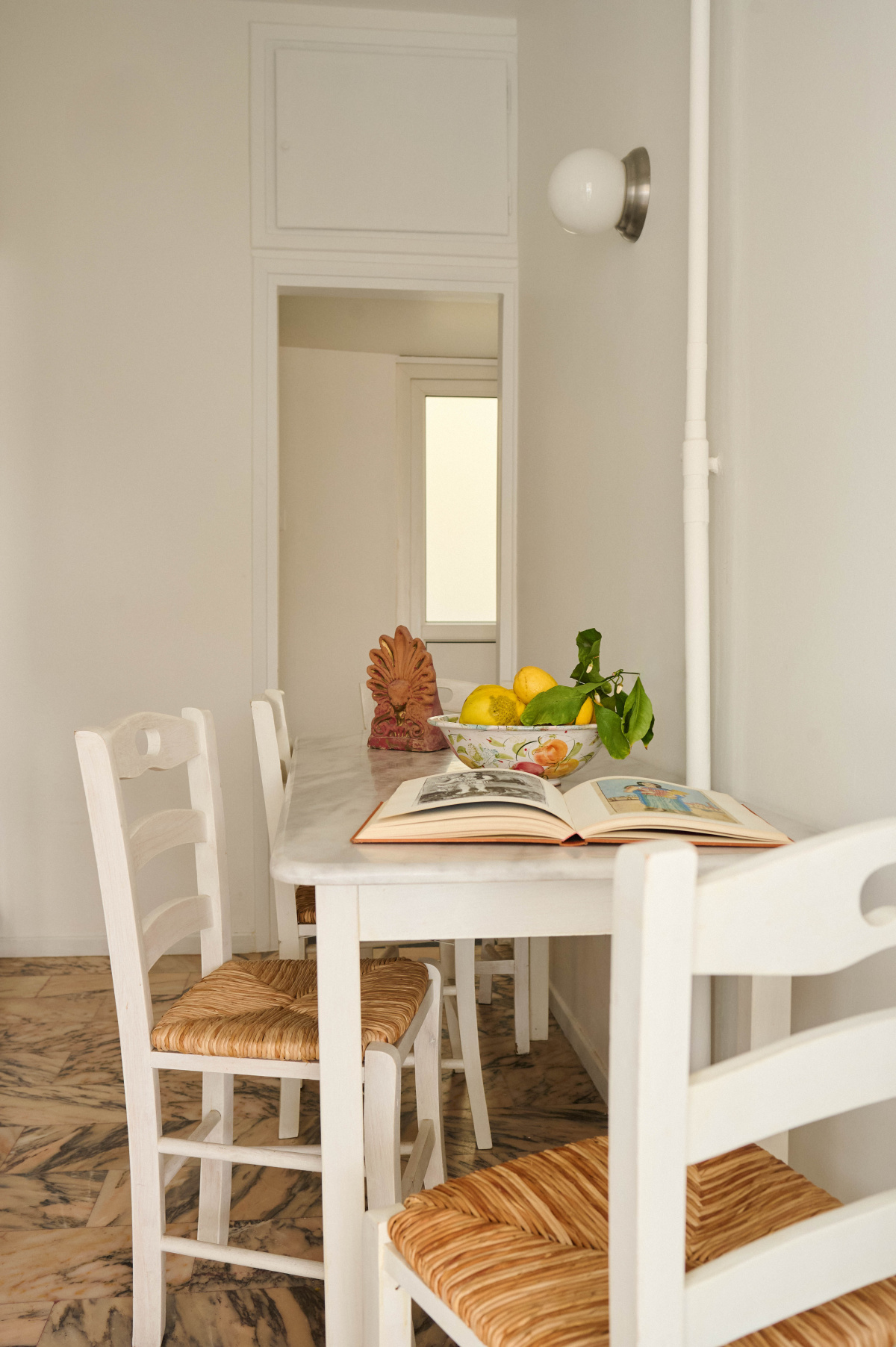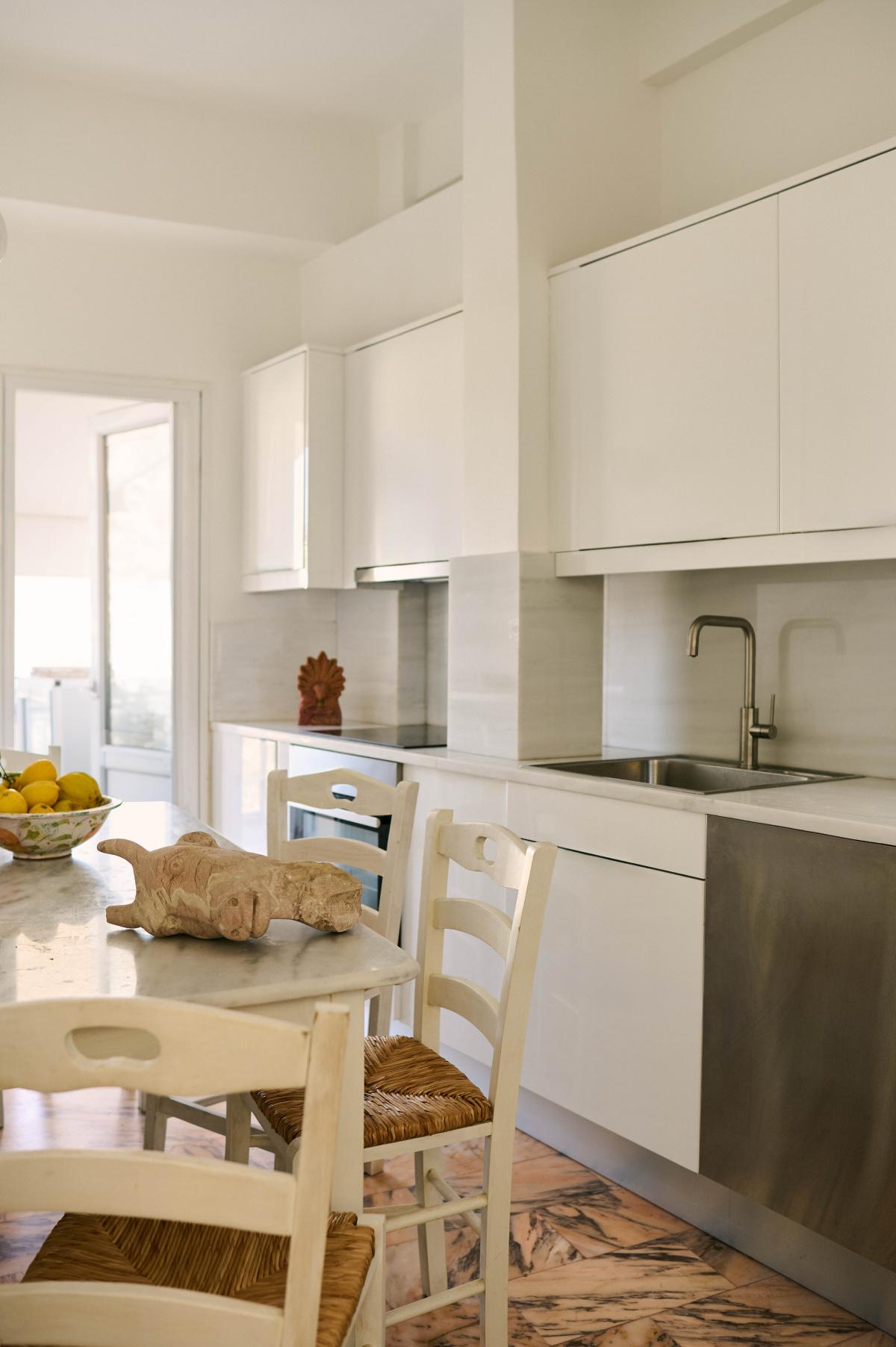 - The kitchen table and white chairs draw direct inspiration from traditional tavernas in the Cycladic islands.