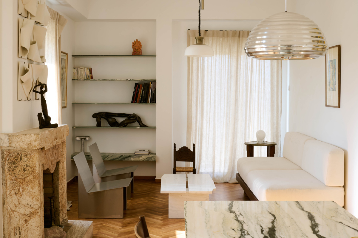 This white marble has real historical significance in Athens. You see it in so many buildings, in the halls of apartment buildings, in public spaces. It’s very classical and humble. The original marble floors in the kitchen and bathroom were preserved completely, as were all the wood floors throughout the apartment.