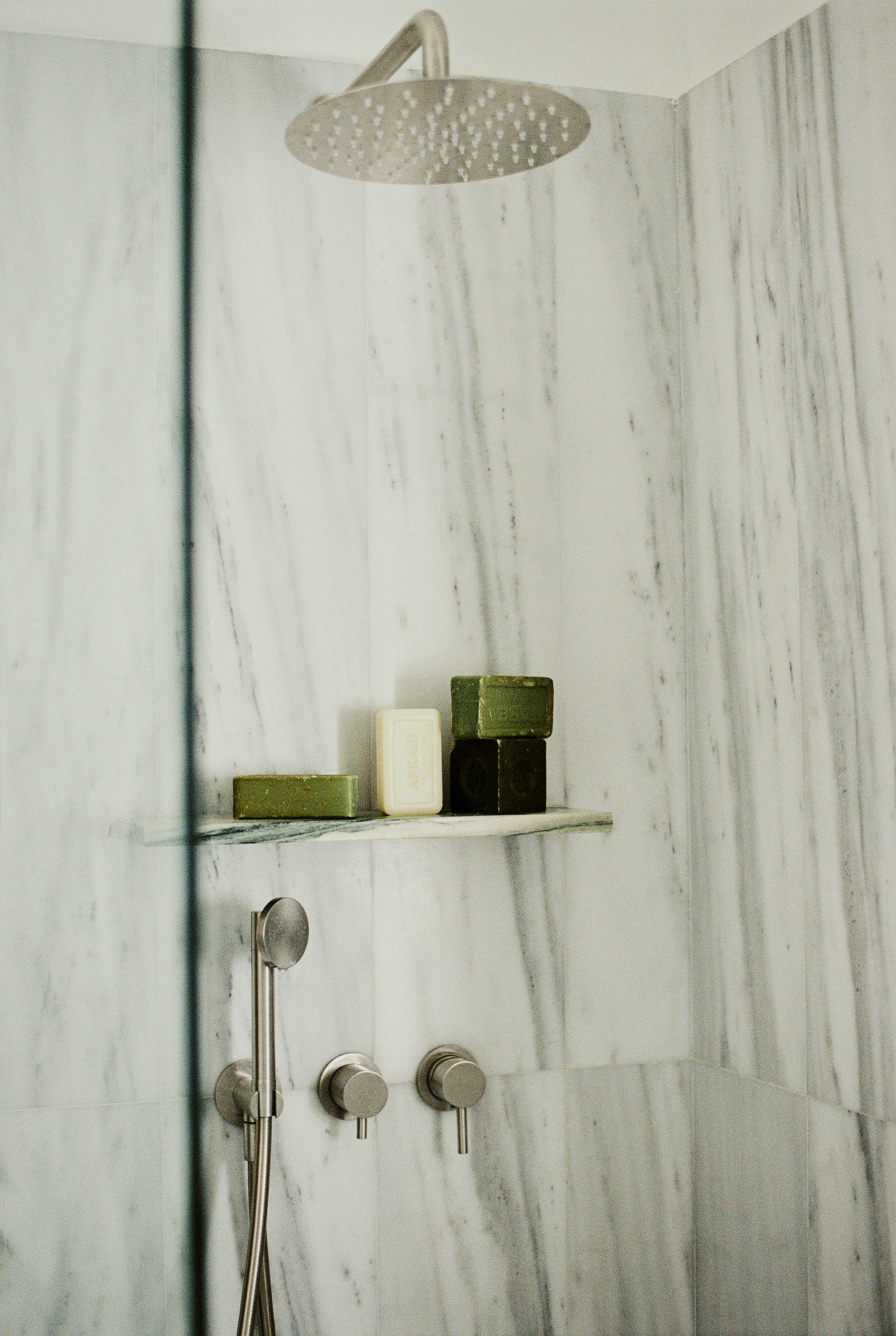 Elena Alexopoulos: The marble was one of our most important material decisions, and we created a very intentional contrast, particularly in the bathroom. We used Italian Cipollino marble, this beautiful stone with distinctive green veining for the sink and certain wall sections. It’s a sophisticated, precious material. But we paired it with a very simple white marble that’s commonly used throughout Greece.